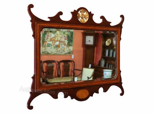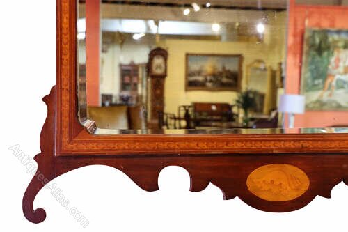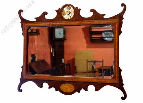 A beautifully crafted mahogany wall mirror, circa 1900, featuring an elegantly shaped frame with scrolling detail and intricate marquetry inlay. The gently silvered mirror plate retains a soft aged patina, adding to its period charm. A decorative gilt roundel at the crest and an inlaid oval panel at the base enhance its refined design, typical of late 19th to early 20th-century craftsmanship.