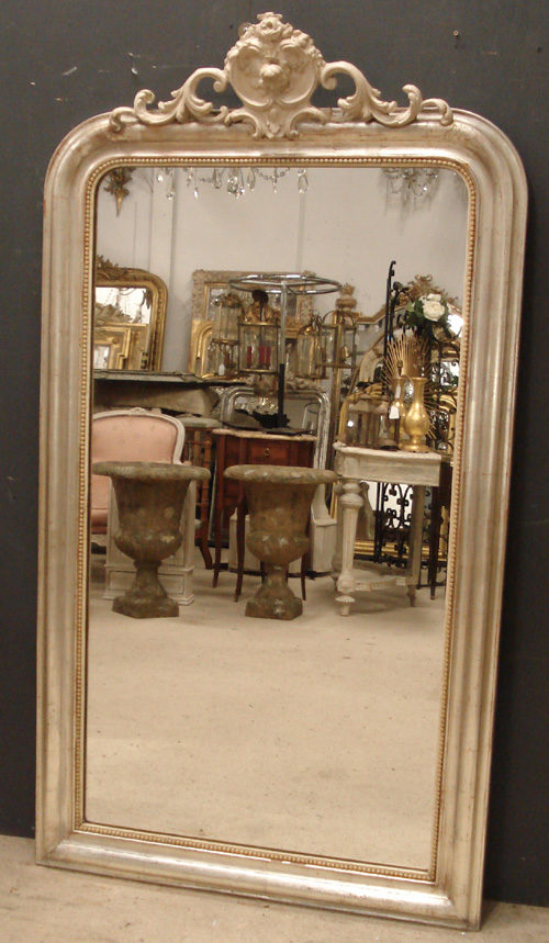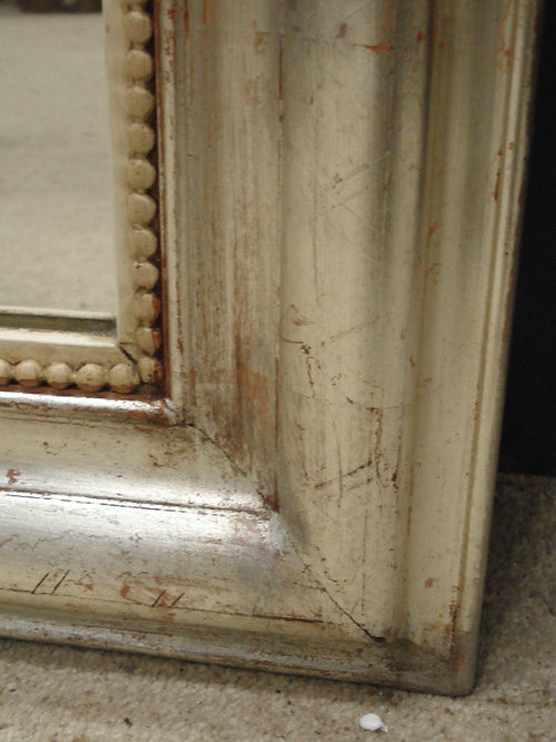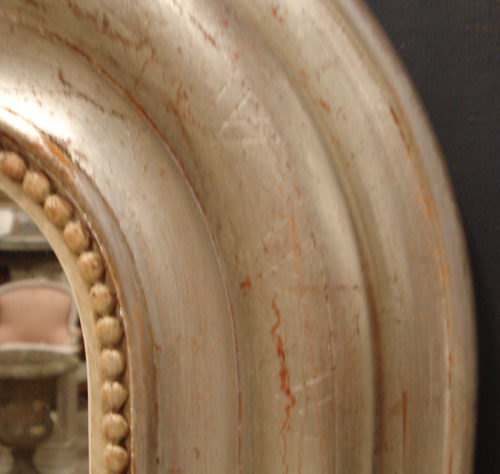 Ref 3263 - Antique French Mirror - Silver Louis Philippe style mirror with polished white painted crest and polished gesso beads to inner frame. Cross hatch etching to frame. Original glass and pine board back. c.1880.