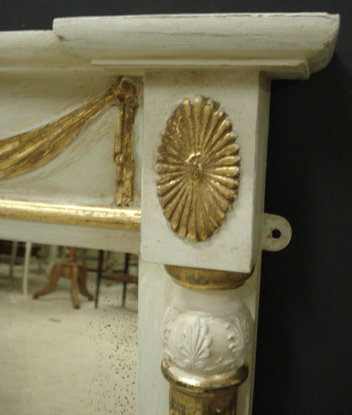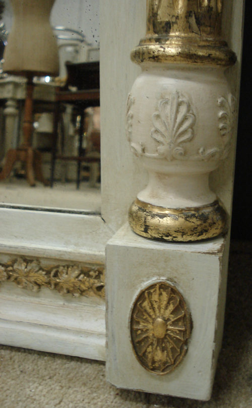 Ref 3524 - Antique mirror - English tripleplate mirror finished in distressed white paint and gilt. Original patinated glass and pine board back. Circa 1890.