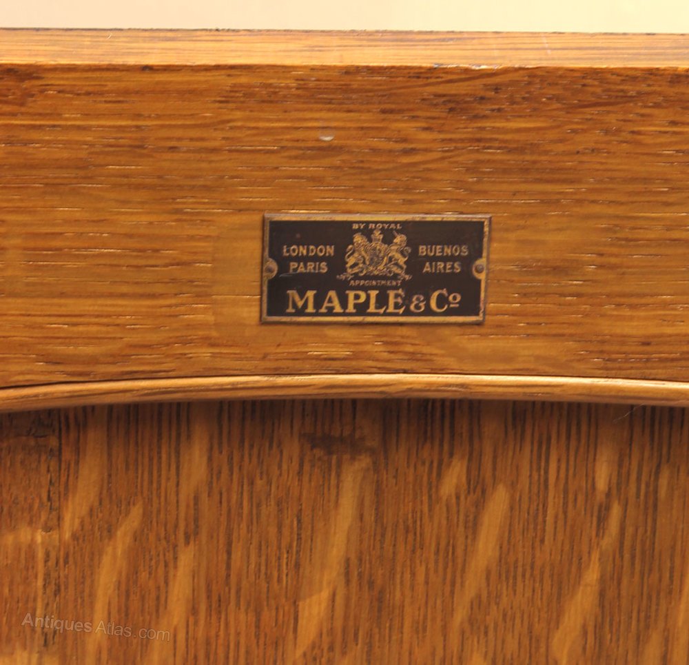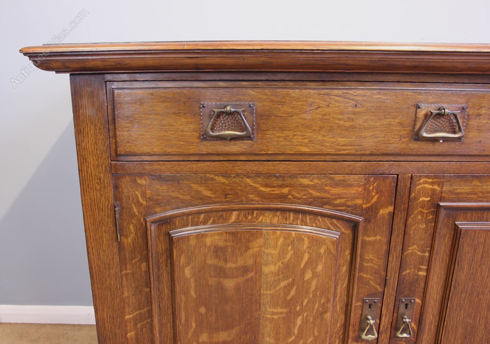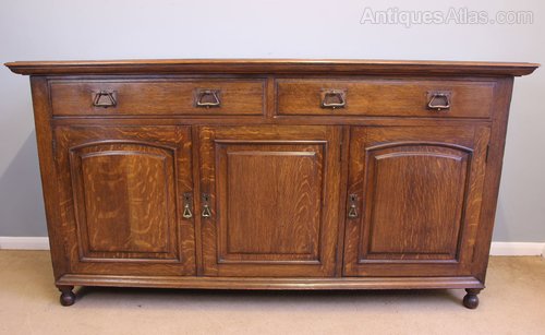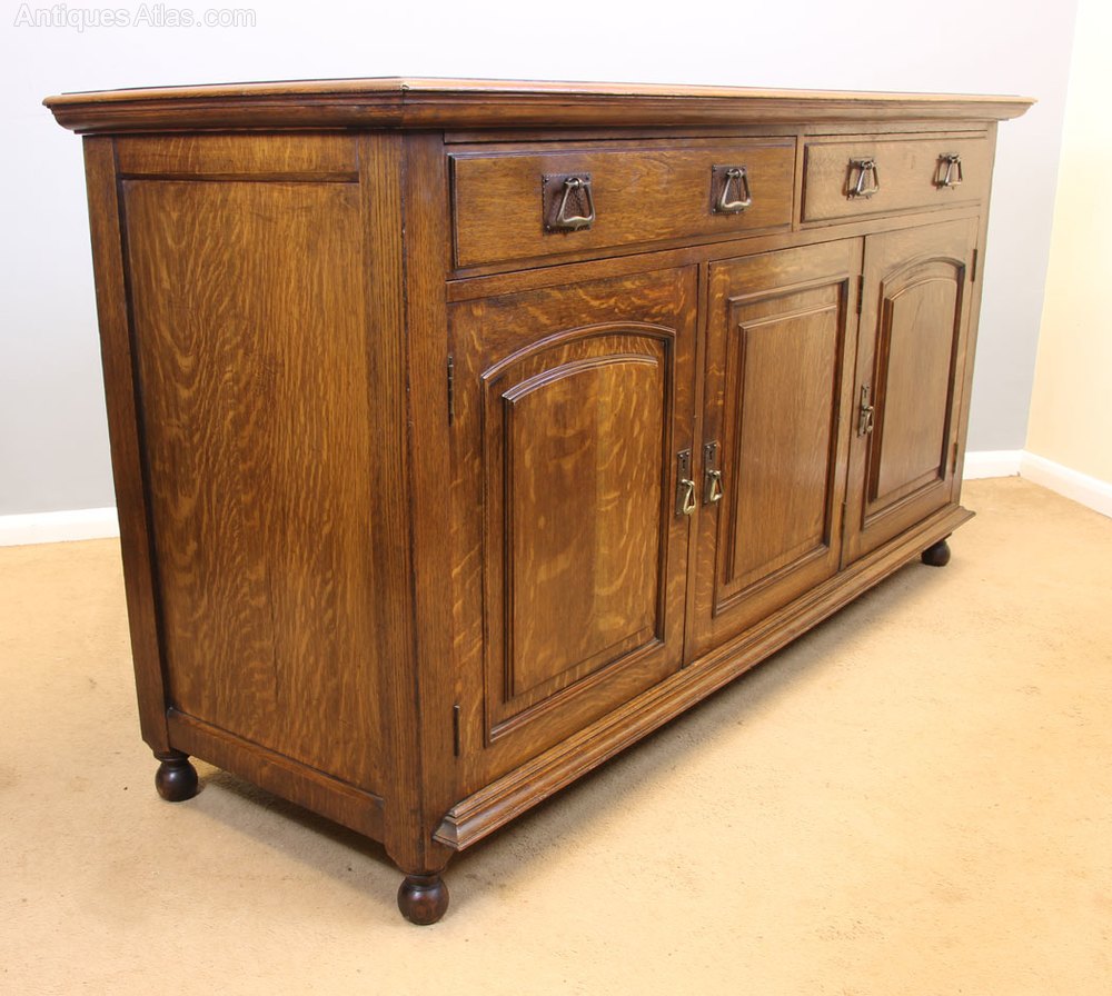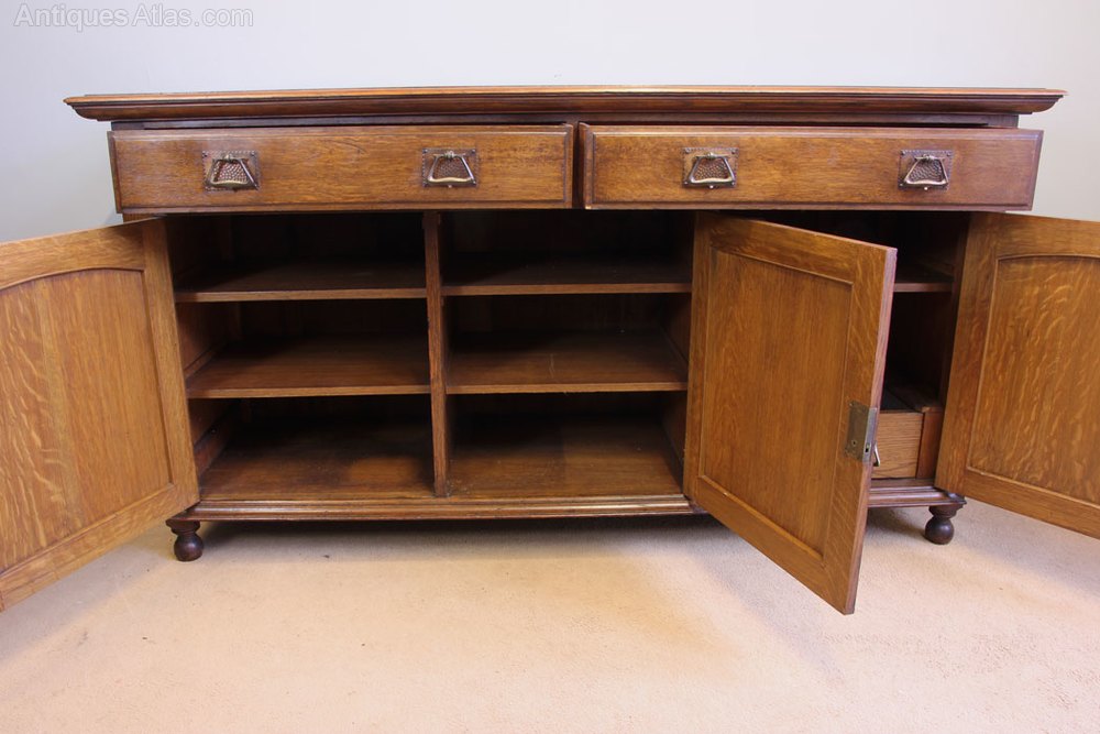 Antique Oak Sideboard Dresser Base. This wonderful oak sideboard / dresser base has a solid oak top with moulded edge under having two drawers with three doors under the door fronts have raised panel with moulded edge. The left hand side and centre cupboard have two storage shelves the right hand side has single shelf with cellarette under. All supported by turned feet. Having Maple & Co Label on the inside of the right hand cupboard door.