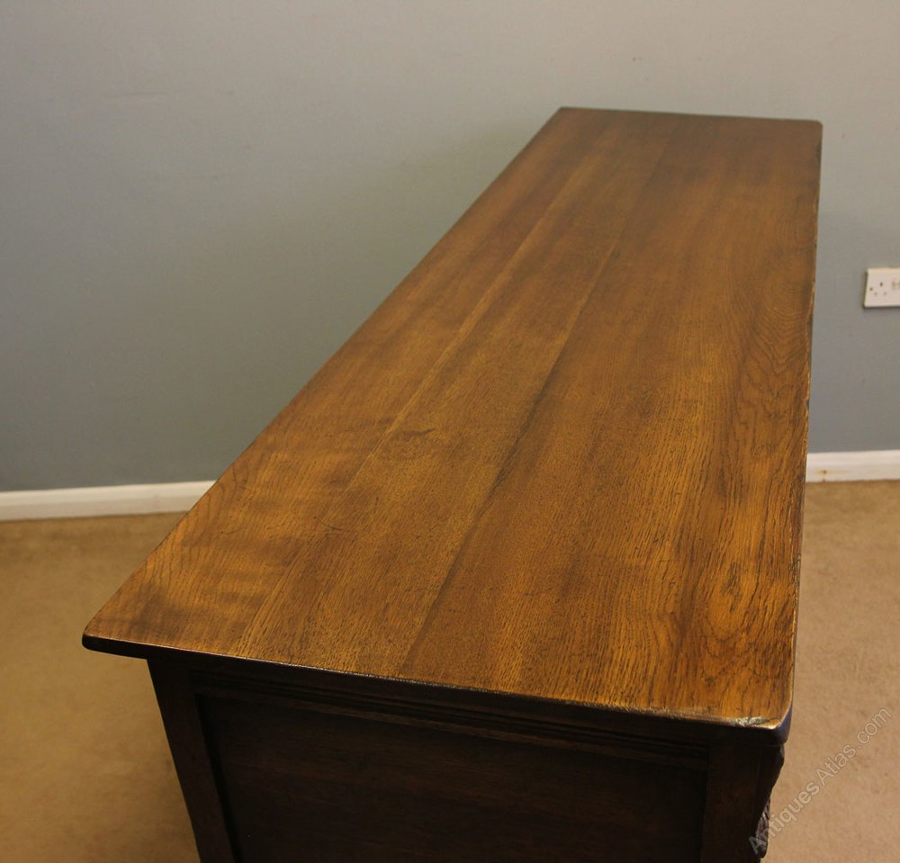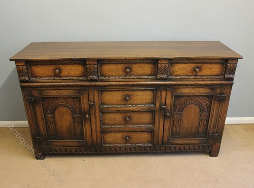 Antique Oak Sideboard Dresser Base. This lovely carved oak dresser base / sideboard has three drawers edge with carved detail and turned wooden handles having carved detail either side and in between the three drawers. Under has three drawers to the centre with carved detail to the edge of each drawer flanked either side by cupboard the two doors have a arched carved panel to the centre. The doors fitted with turned wooden handles and shaped metal hinges. The sides of the dresser base having panelled sides. The interior having single storage shelf.