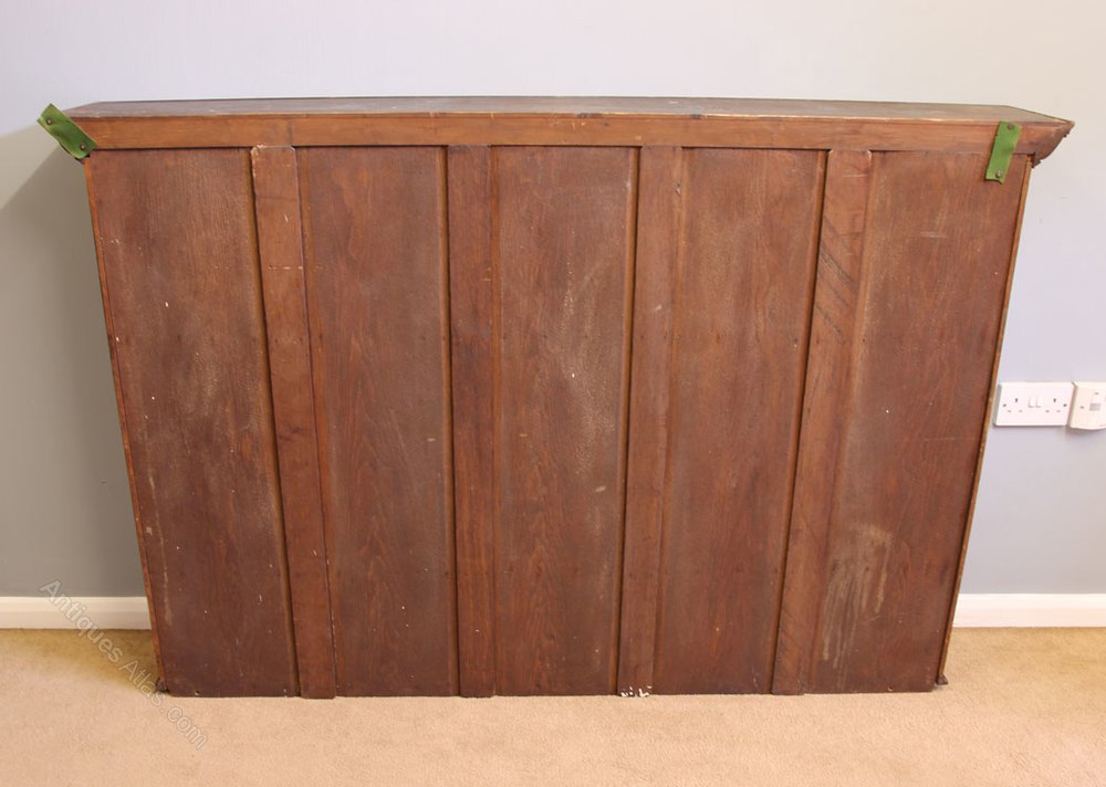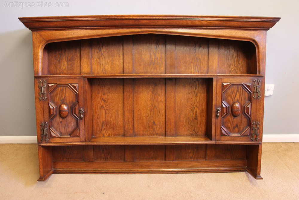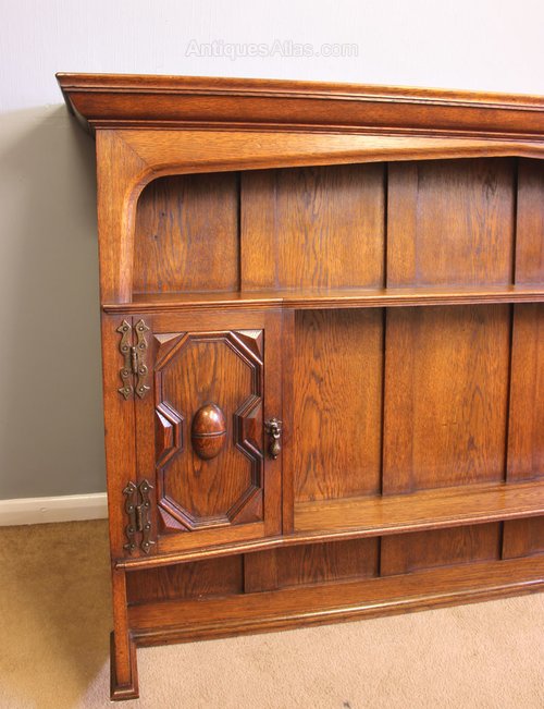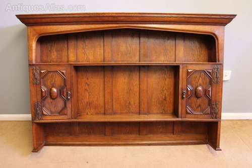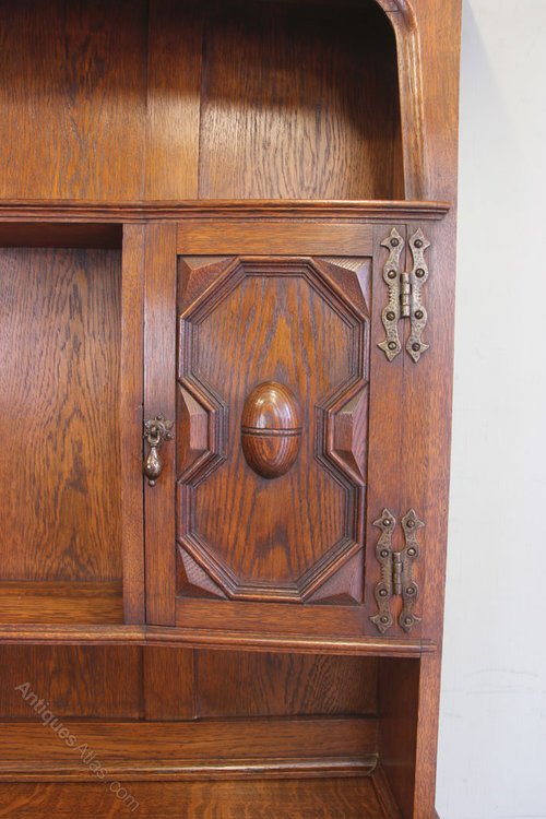 Antique Oak Sideboard Dresser Top, This antique oak dresser plate display shelves has a moulded cornice with two shelves under also having a cupboard either side with moulded panels.