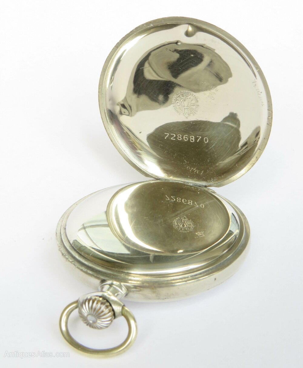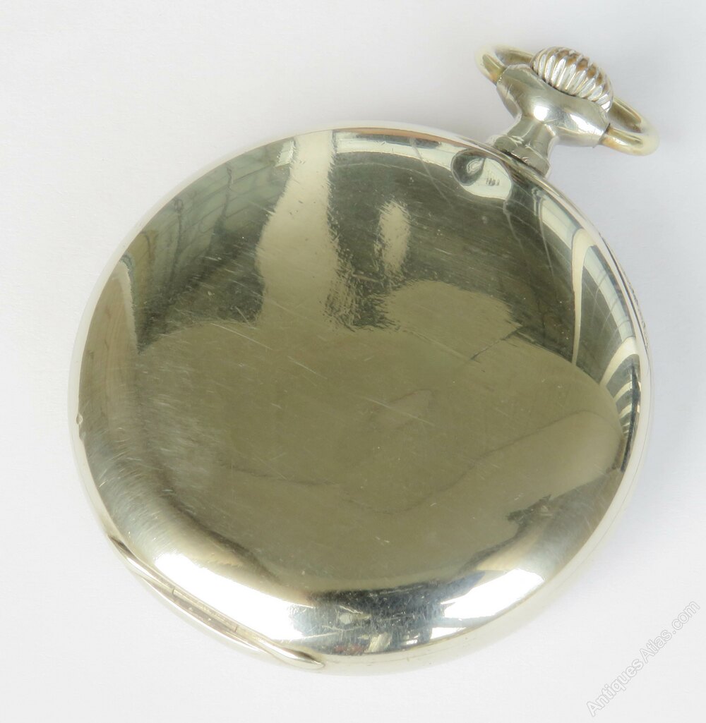 The watch measures 48mm diameter excluding the winding stem and the loop. The case is nickel. The front and sides of the case are in good condition, the hinged case back has some unevenness.