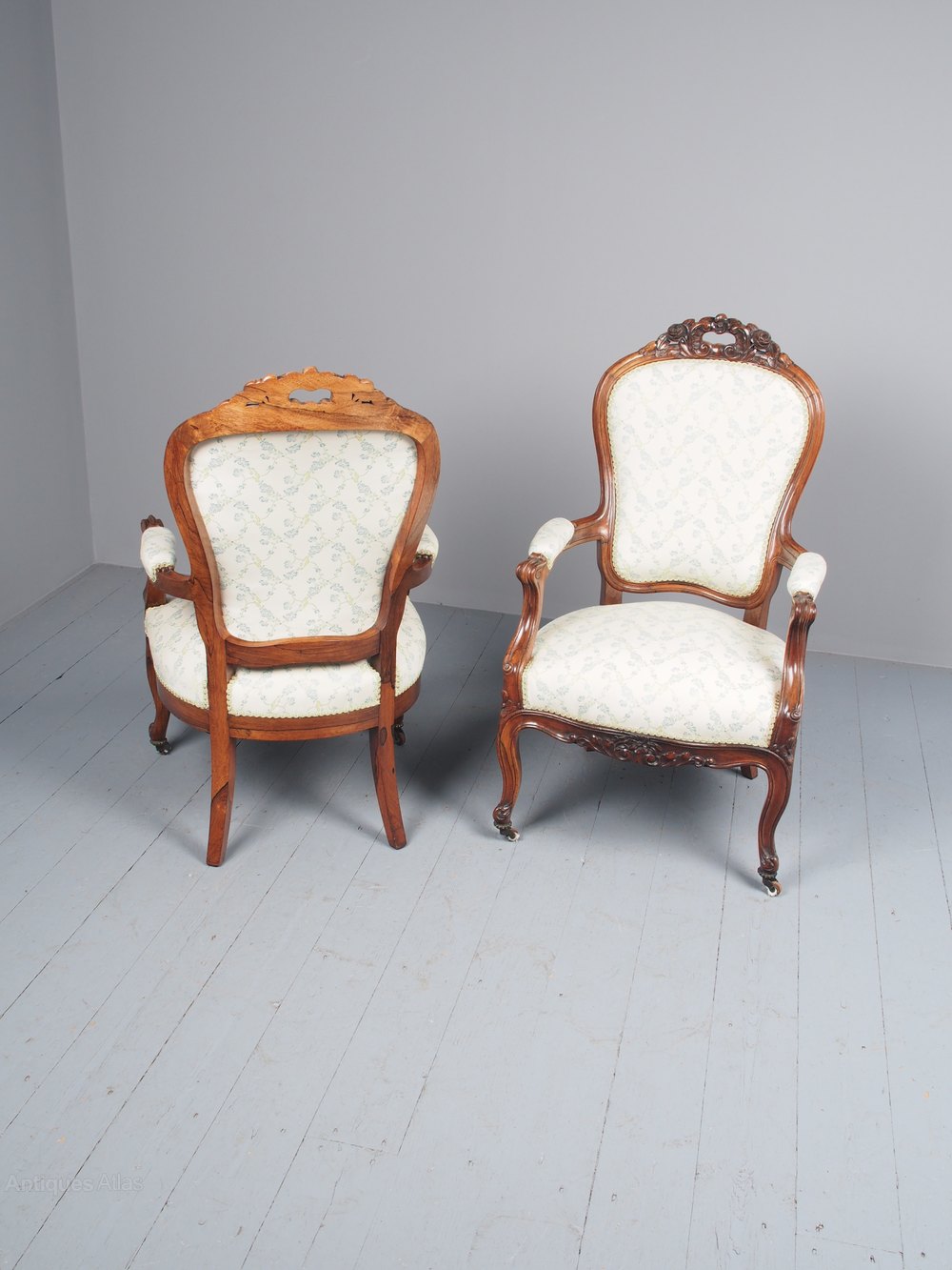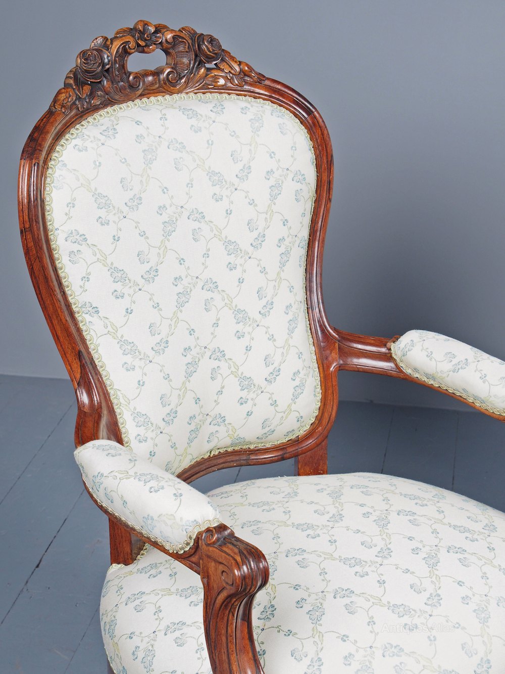 Circa 1860, pair of French rosewood armchairs. The shaped, upholstered backs with fluted and foliate carved, pierced and open crest frames, over partially upholstered arms on fluted supports. With generous stuffover seat, and all recently reupholstered in a floral fabric, finishing with green and gold gimp. Standing on cabriole legs with original brass caps and wooden castors