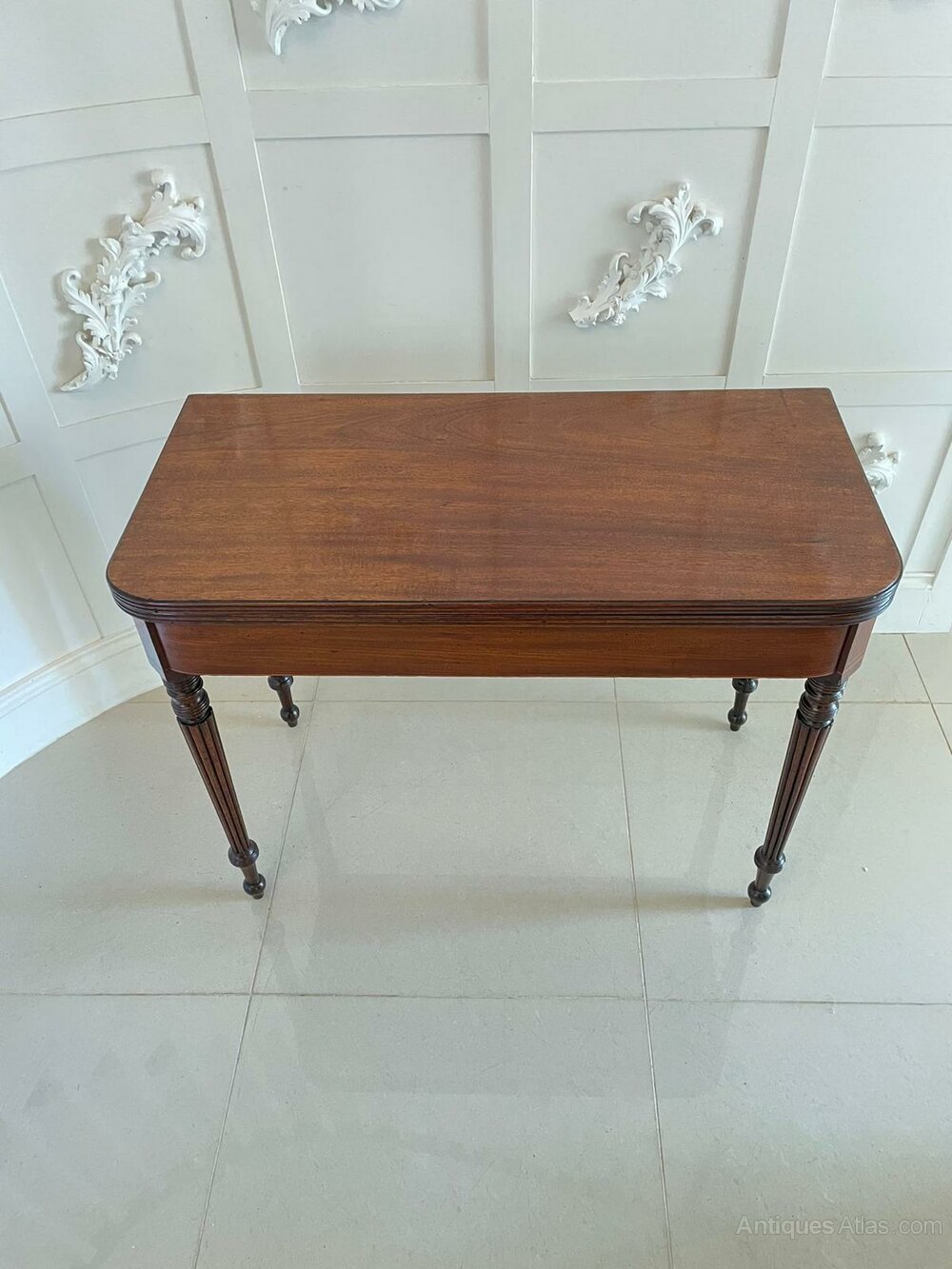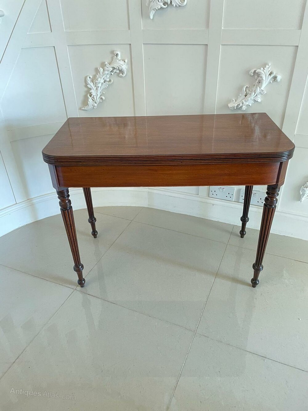 Antique regency quality mahogany card/side table having a quality mahogany top with a reeded edge opening to reveal the original baize interior, mahogany frieze with inlaid satinwood stringing and standing on four quality mahogany reeded tapering legs with turned feet.