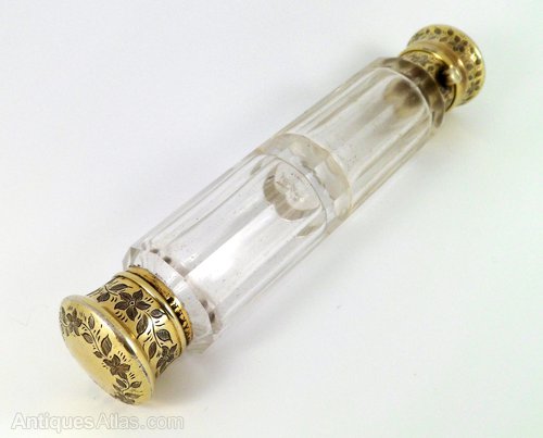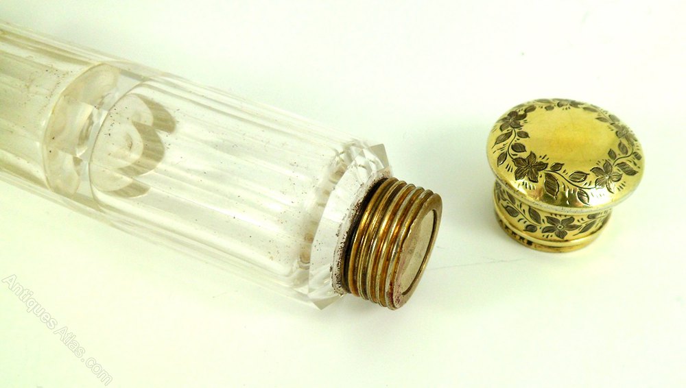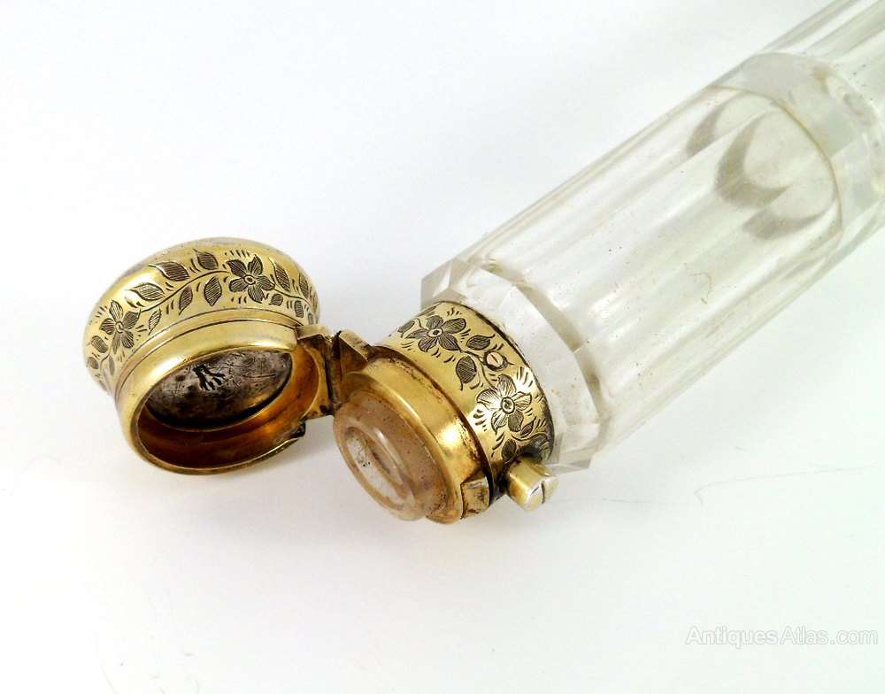 A Beautiful Sampson Mordan double ended solid silver gilt scent & smelling salts bottle. A faceted clear glass body and floral engraved gilt tone mounts. One hinged for scent and the other screw top for smelling salts.