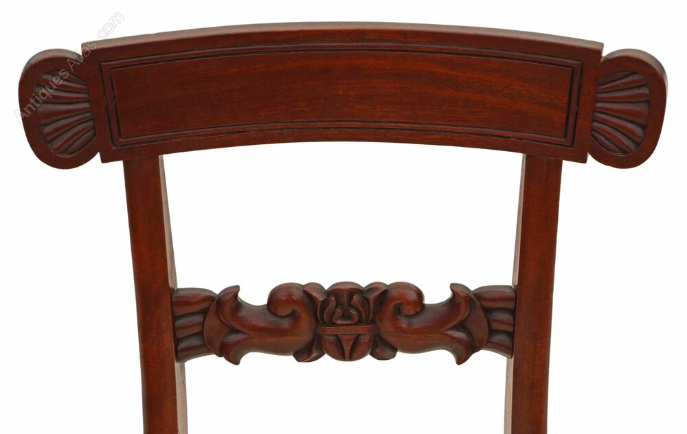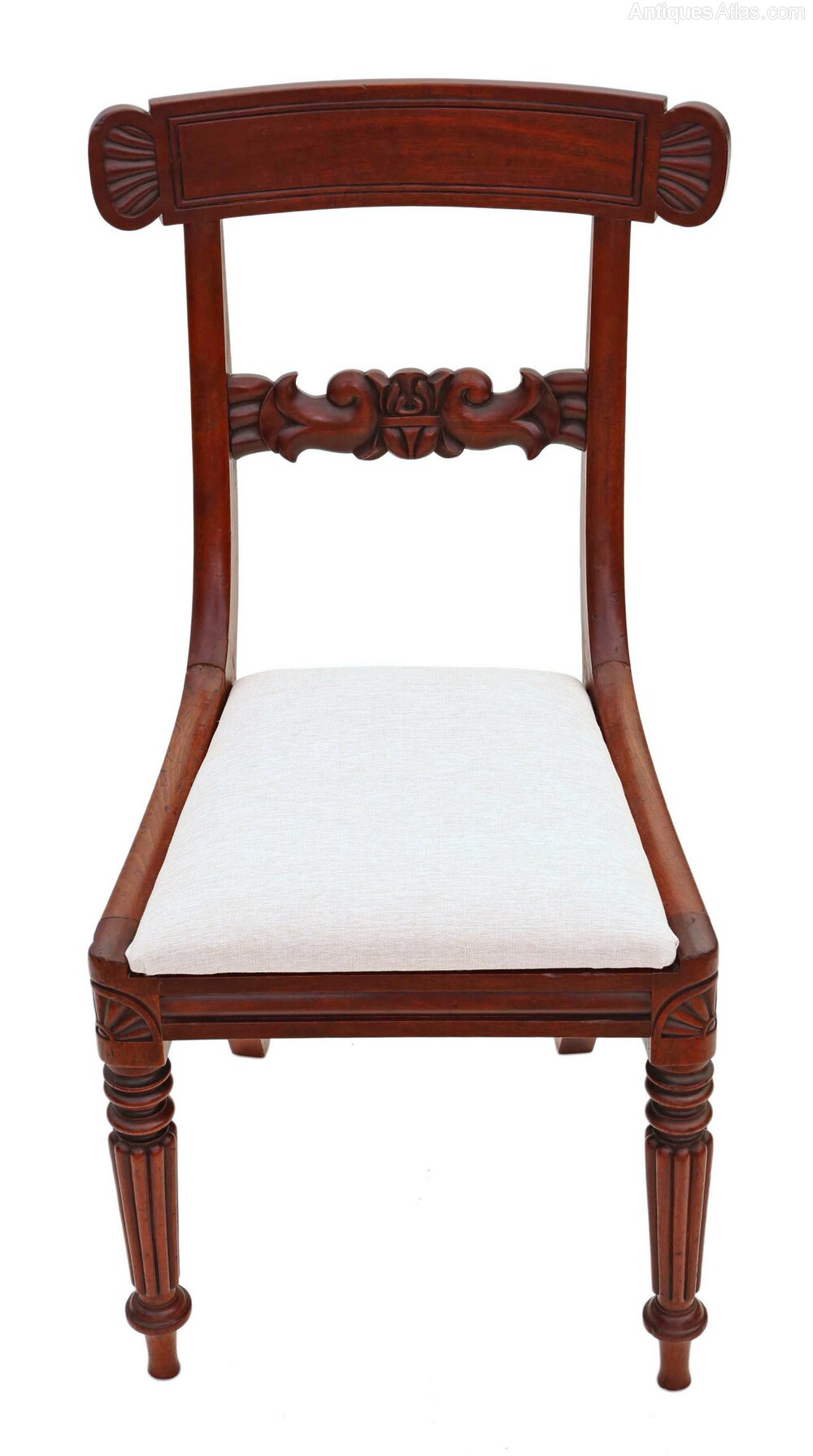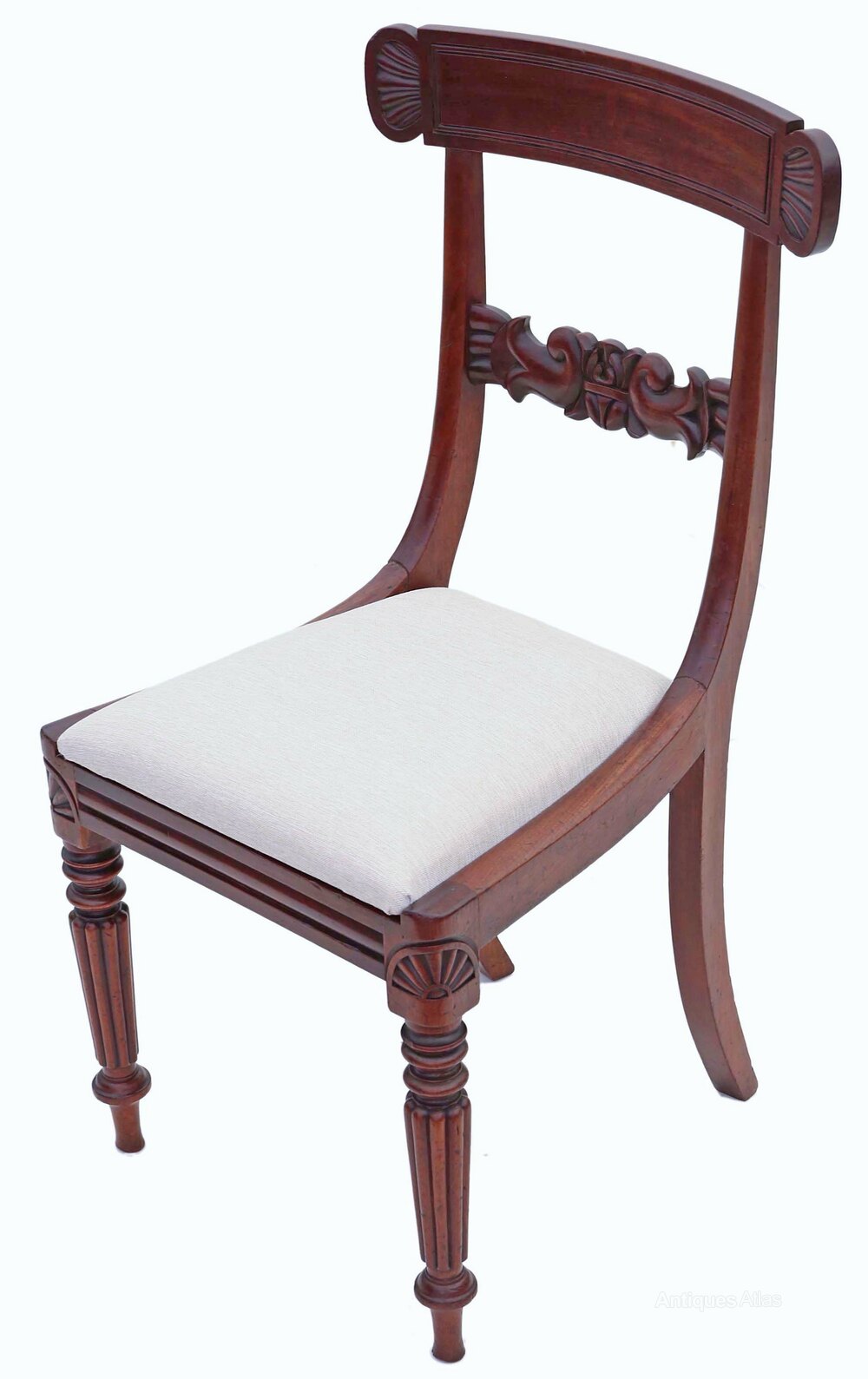 Antique set of 4 William IV carved mahogany dining chairs dating back to approximately 1835, featuring impressive melon-fluted legs.