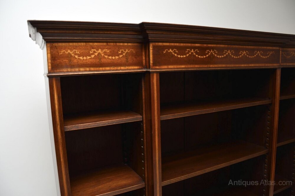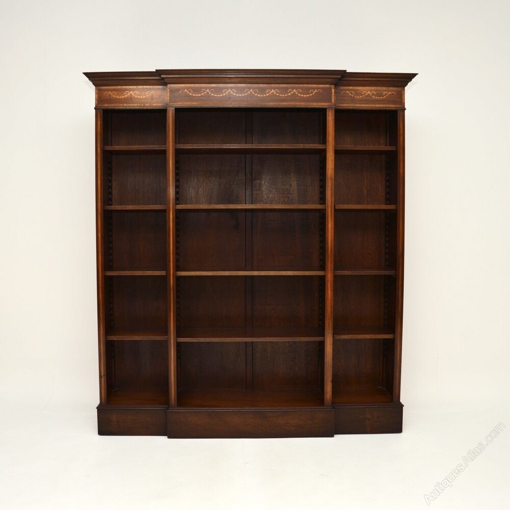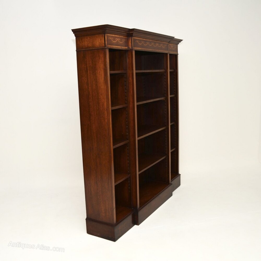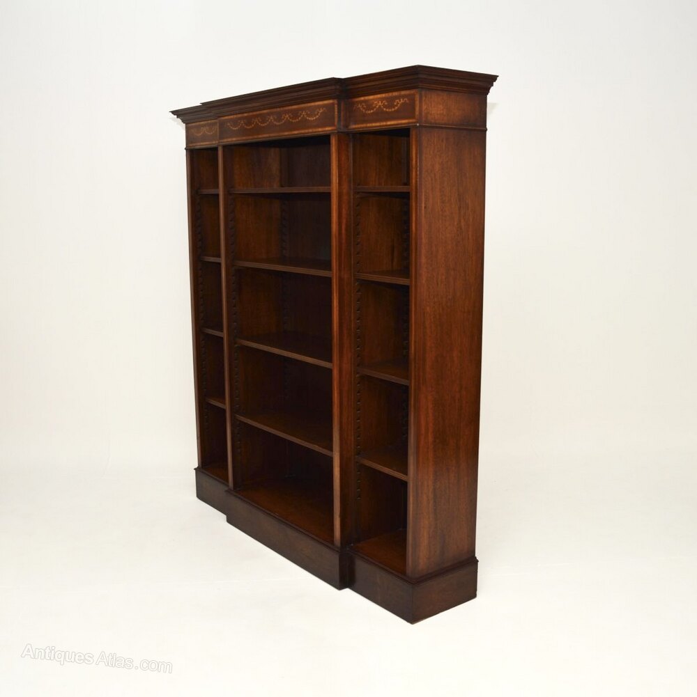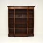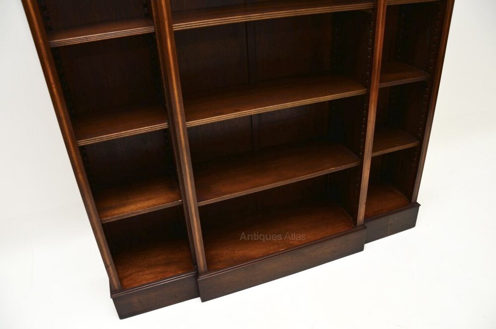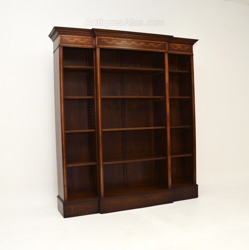 It is very well made and of superb quality, with a smart breakfront design. The mahogany has a lovely colour tone and patina, there is stunning satin wood inlay on the cornice and down the front edges. There are many adjustable shelves offering lots of storage space in the three open sections. This is tall and a good width, while also not very deep, so doesn’t jut out too far into the room.