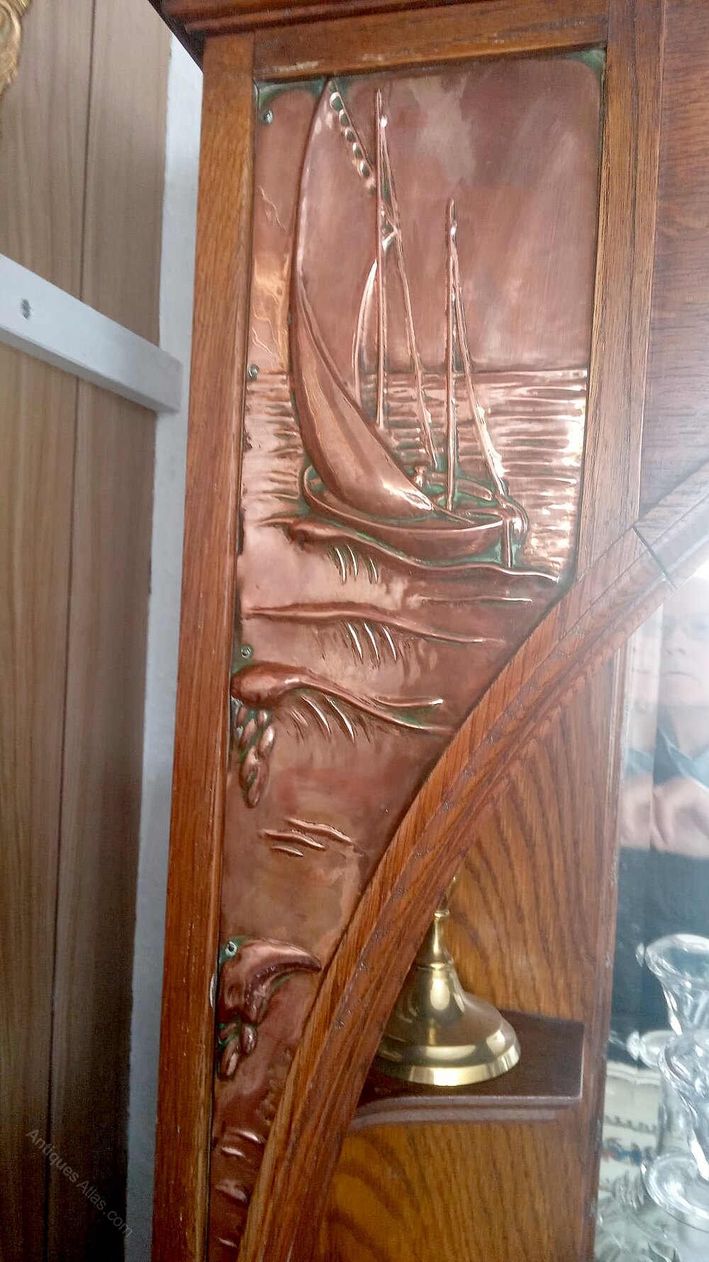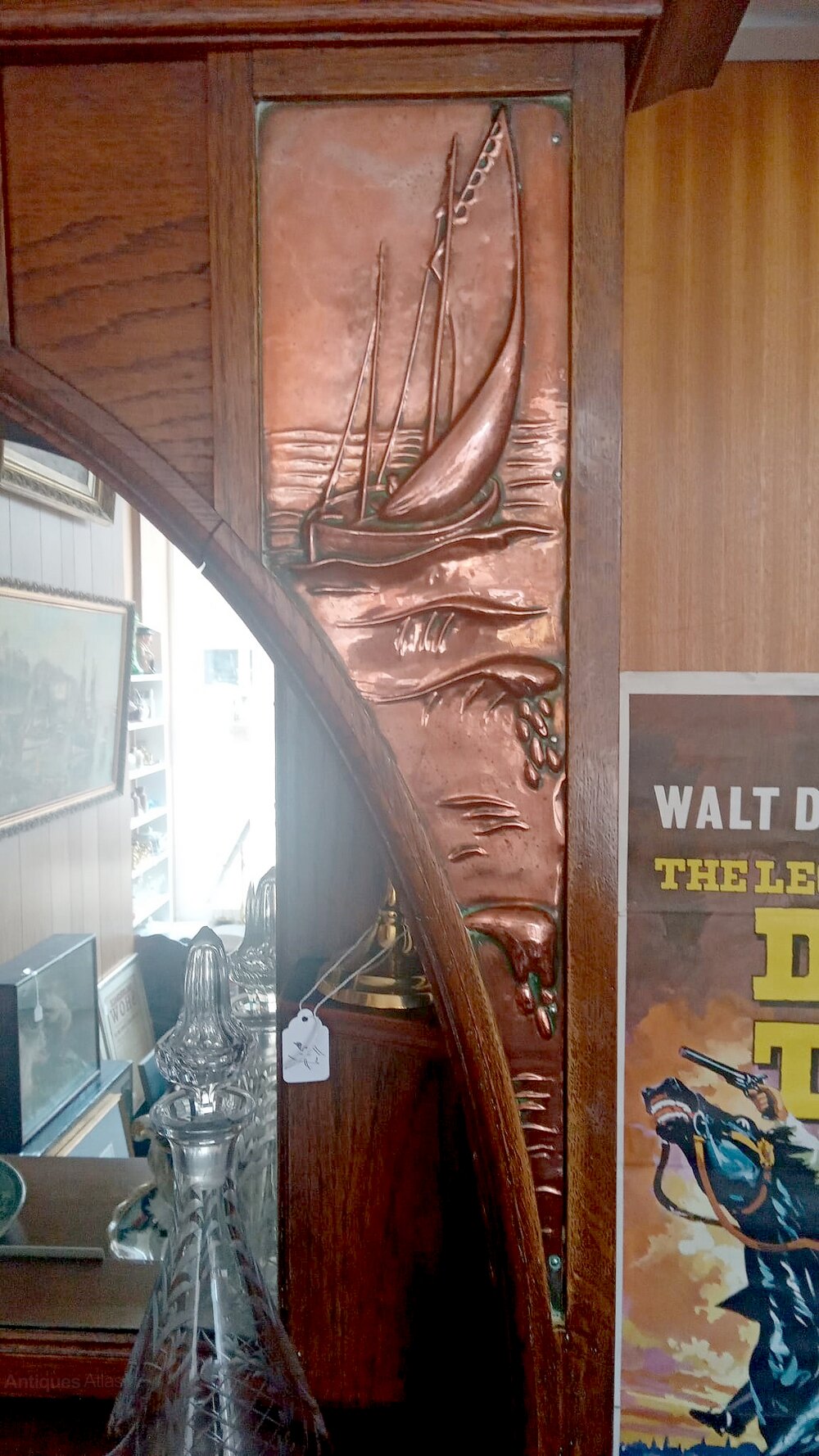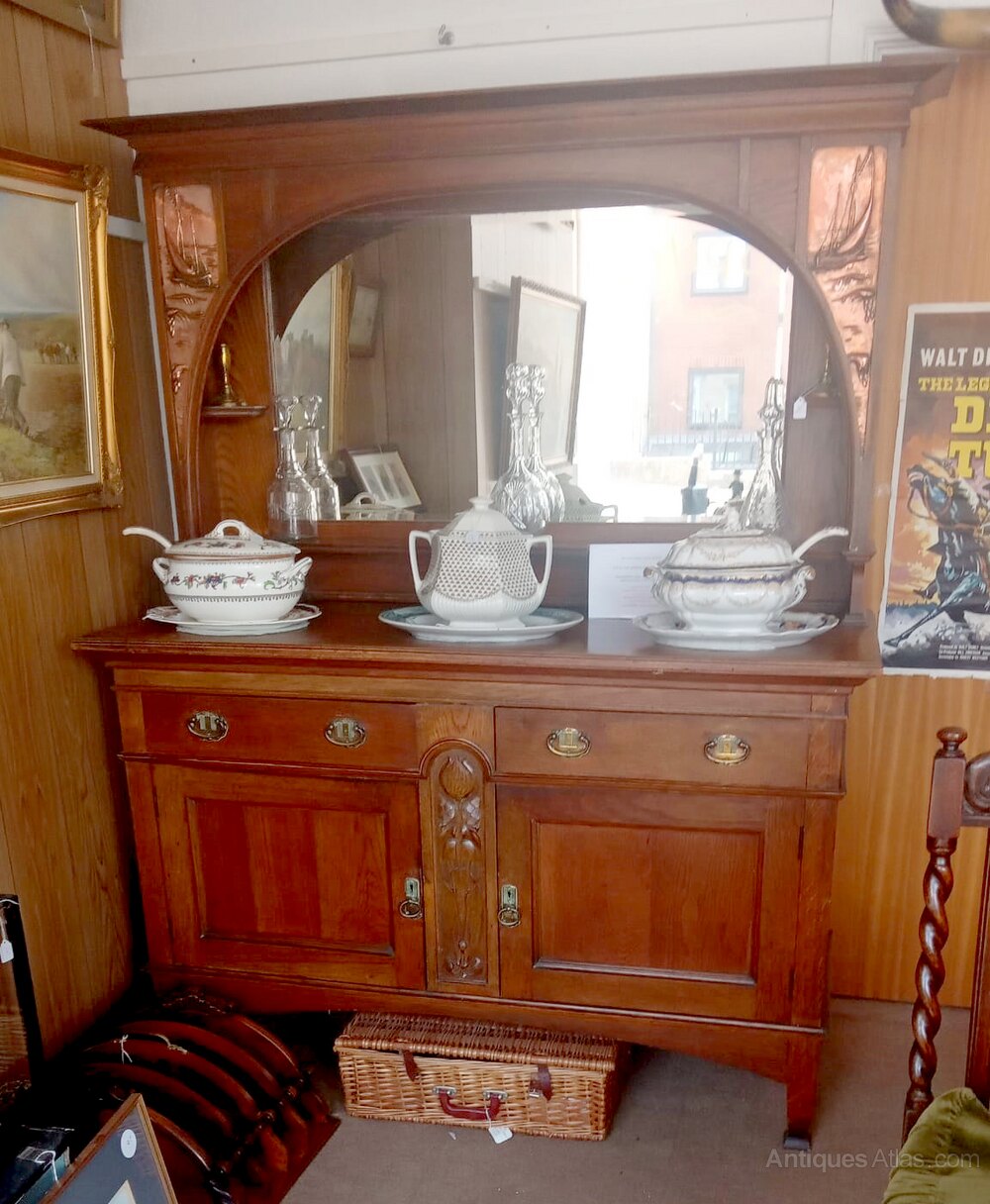 Here is an ARTS & CRAFTS Mirror Backed Sideboard. It is made of Solid Oak and has Large Drawers with 2 Large Cupboards underneath, one having a Wine Storage section. There are 2 very nice Copper Embellishments either side and the Mirror sits beneath a nice Curved Arch. There is between the Cupboards a Carved piece of Oak nicely done. All in all this Sideboard is in Very Good Condition respecting its age from 1890-1910 The Measurements are Height 194cm-Width 160.5cm-Depth 62cm. The height to the Top of the Base is 99cm. Reasonably Priced at £390---Another same style as this seen recently on Ebay going at £595!
