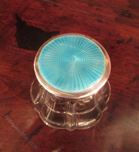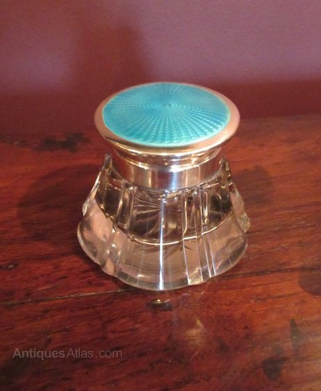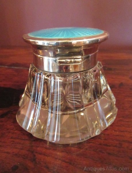 A George V period antique silver & enamel topped inkwell. Hallmarked Birmingham 1912. Made by Herbert Scott Murdoch. Turquoise engine turned hinged top. Clear hallmarks. Cut glass body with star cut base. Excellent condition. Measures 3"diameter x 2.75"high. Stock no.32773.