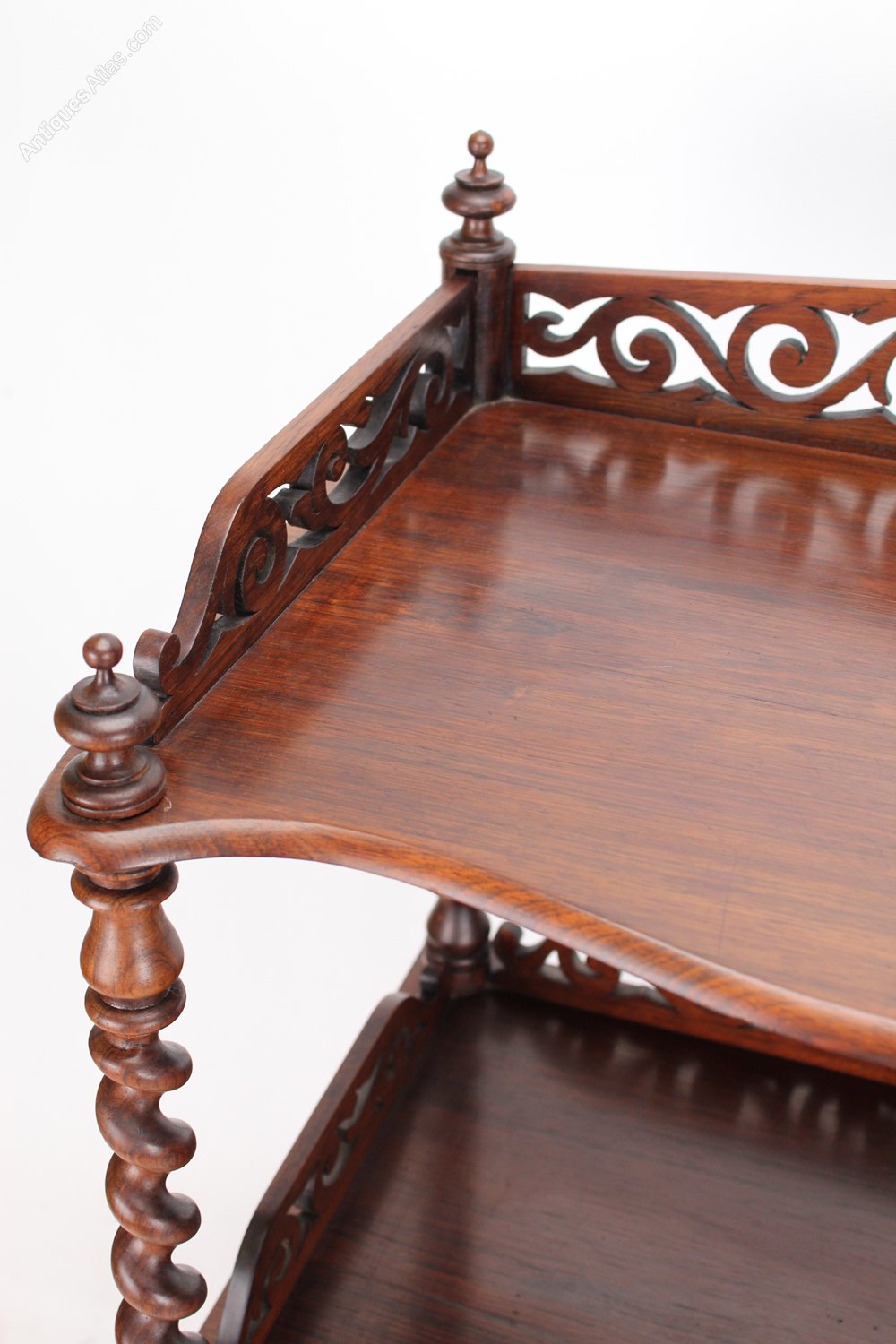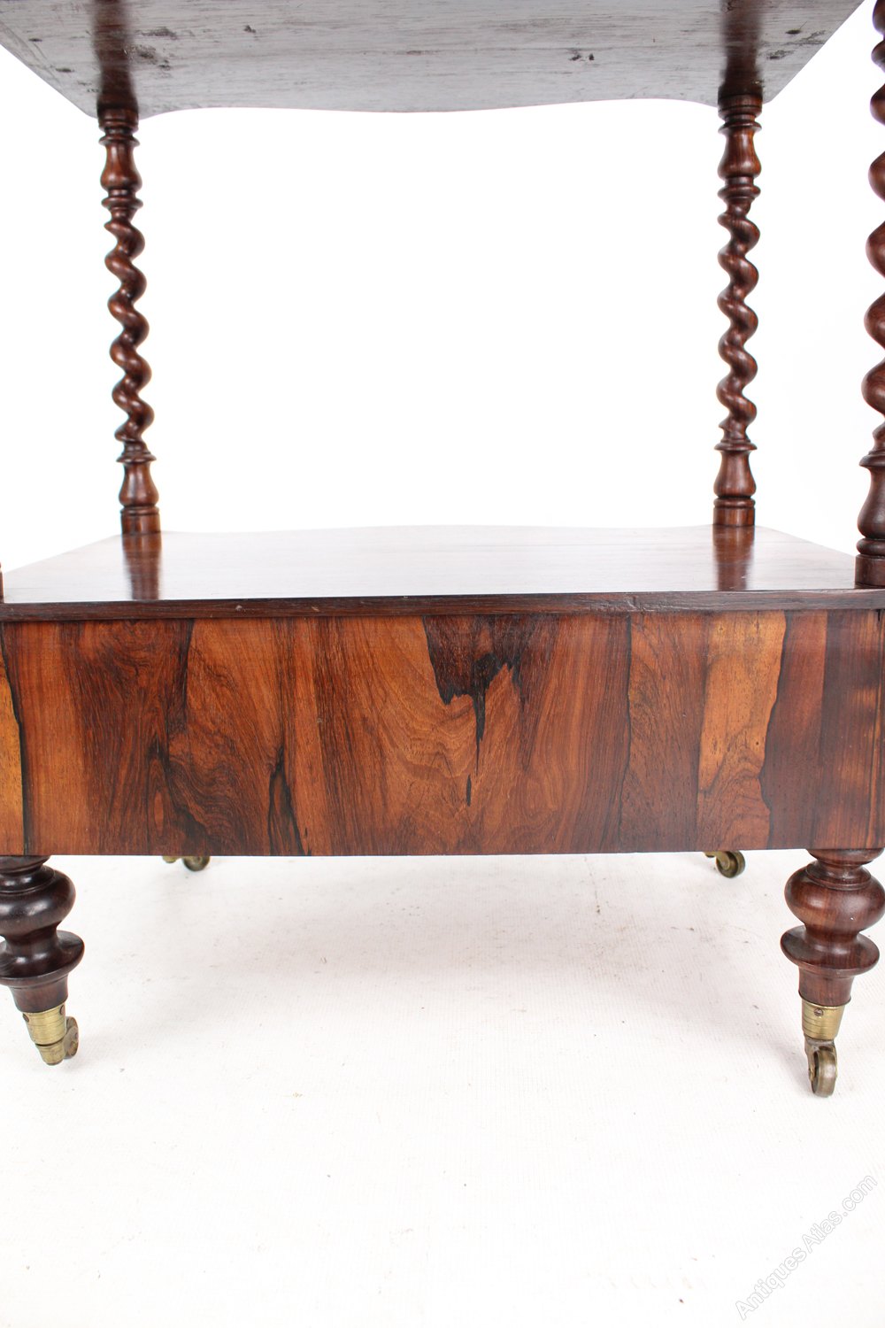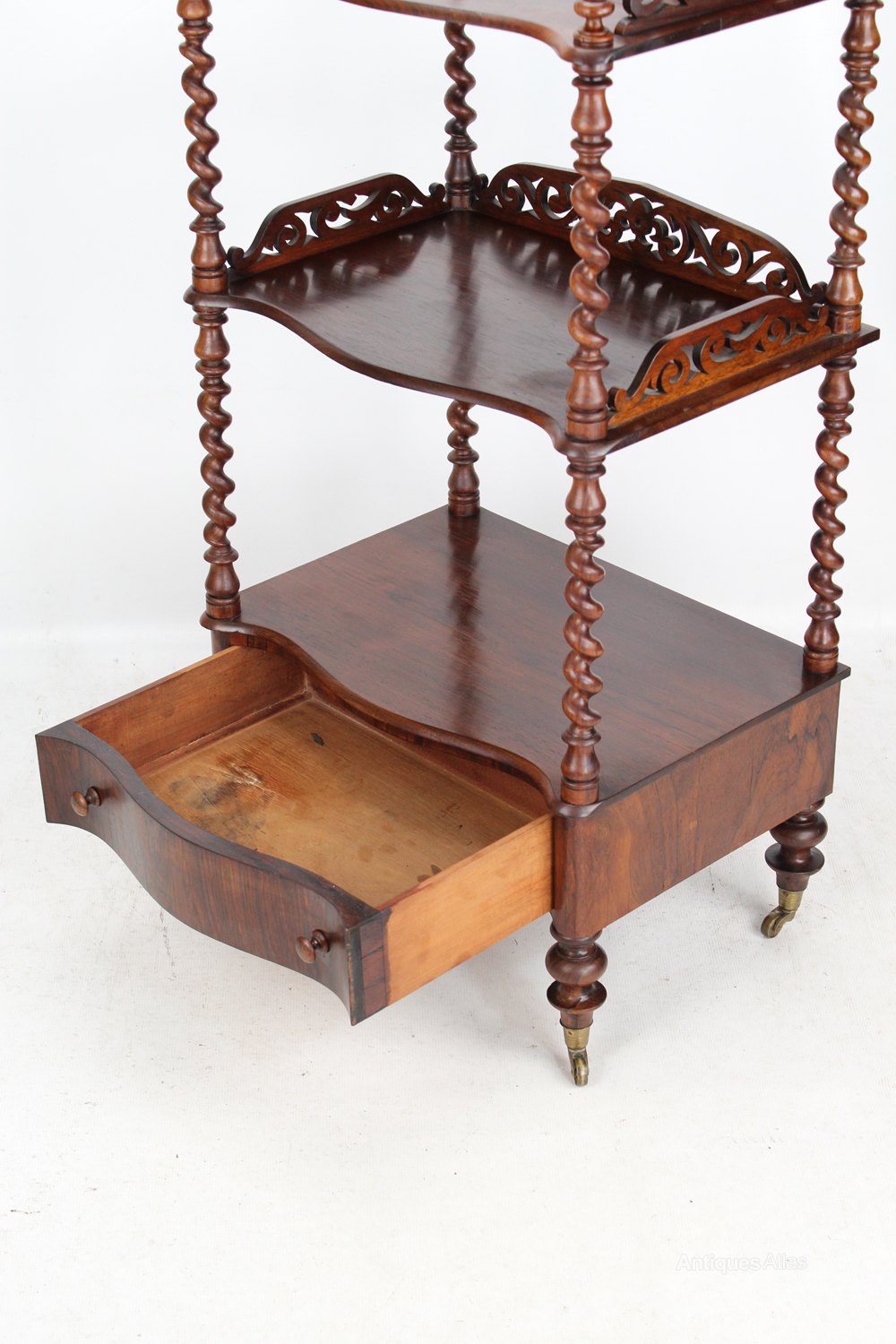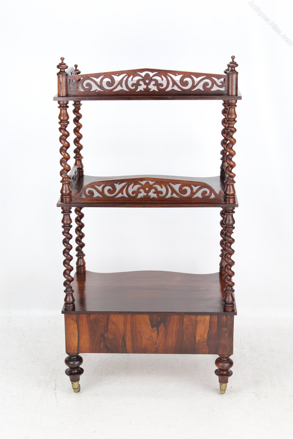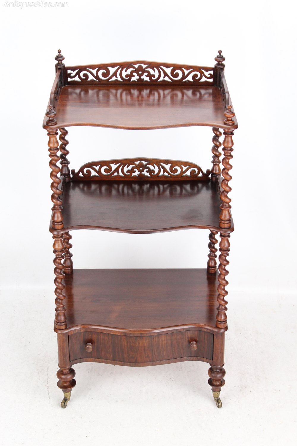 A superb mid Victorian three tier rosewood whatnot dating from circa 1870. The three serpentine front shelves with barley twist supports and pierced fretwork galleries to the sides. It has turned finials to the top and a serpentine fronted single drawer to the base and terminates in turned feet with original brass casters. In very good condition, with beautifully figured rosewood with good colour and patina.