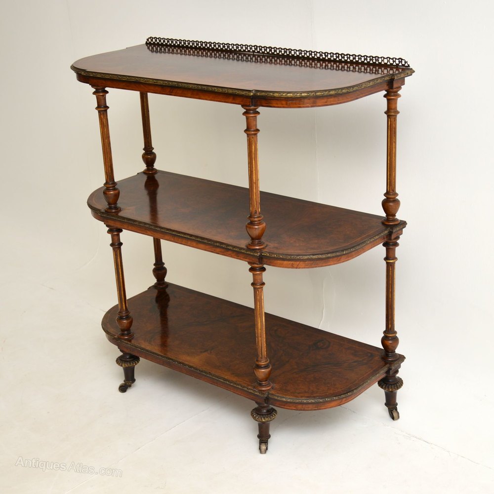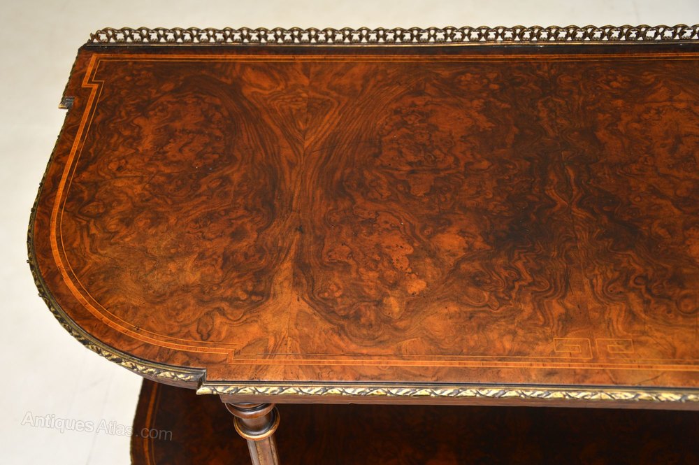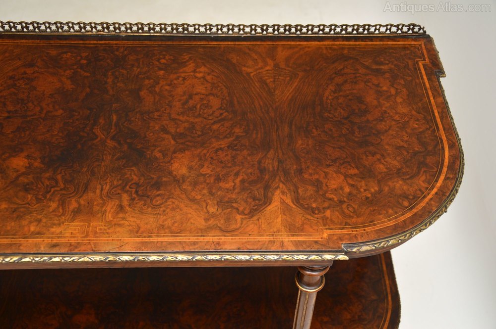 The quality is superb, this has wonderful burr walnut veneers on each tier, bordered with satin wood inlay. Each tier also has gilt bronze mounts on the front edge, there is a gorgeous pierced gallery on the top tier and the bun feet also have gilt bronze mounts. The uprights are beautifully turned and fluted while the turned feet sit on original casters.