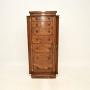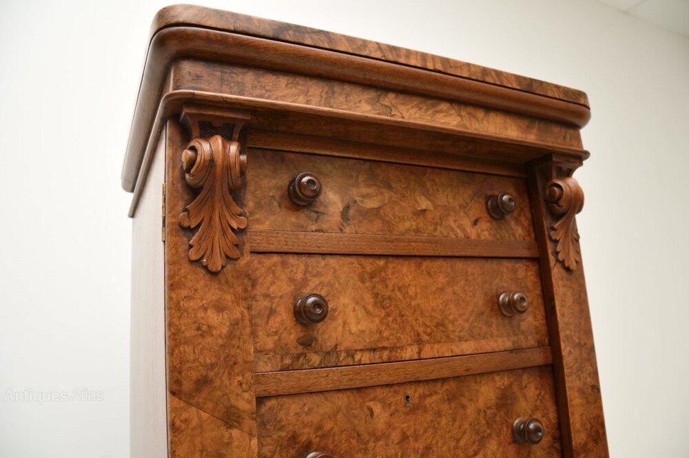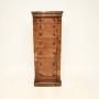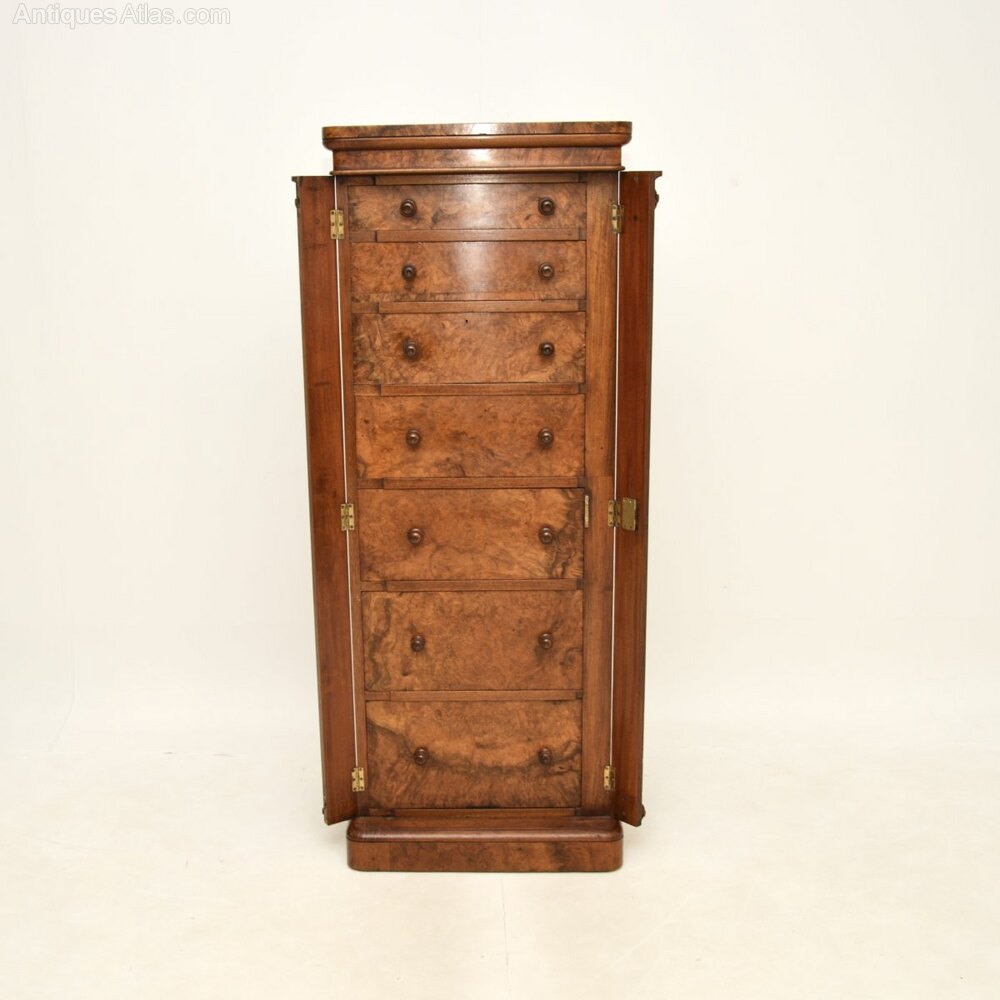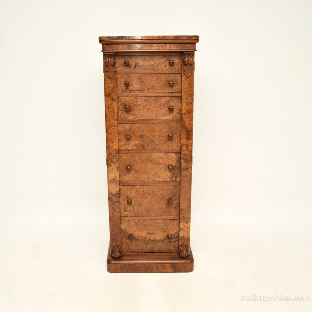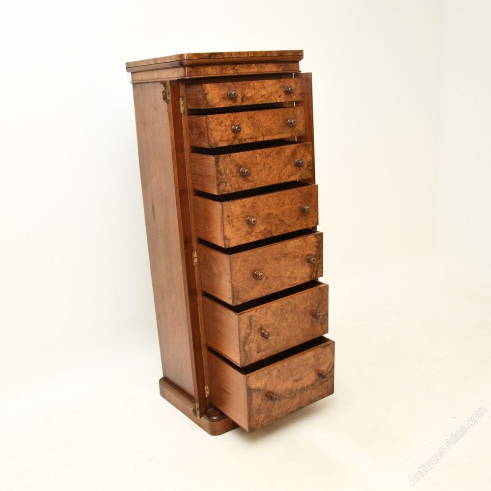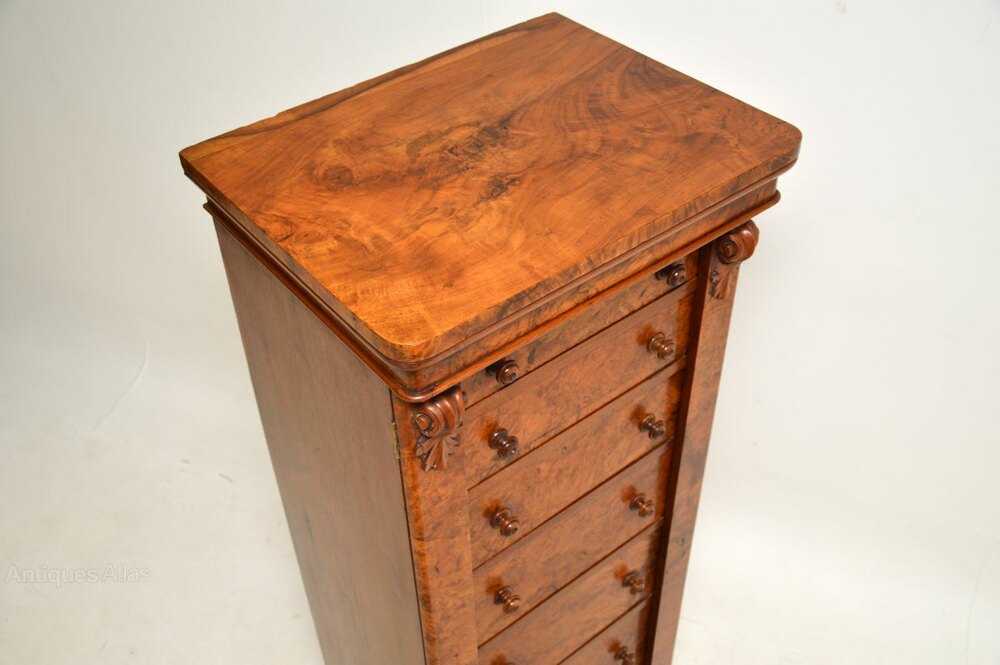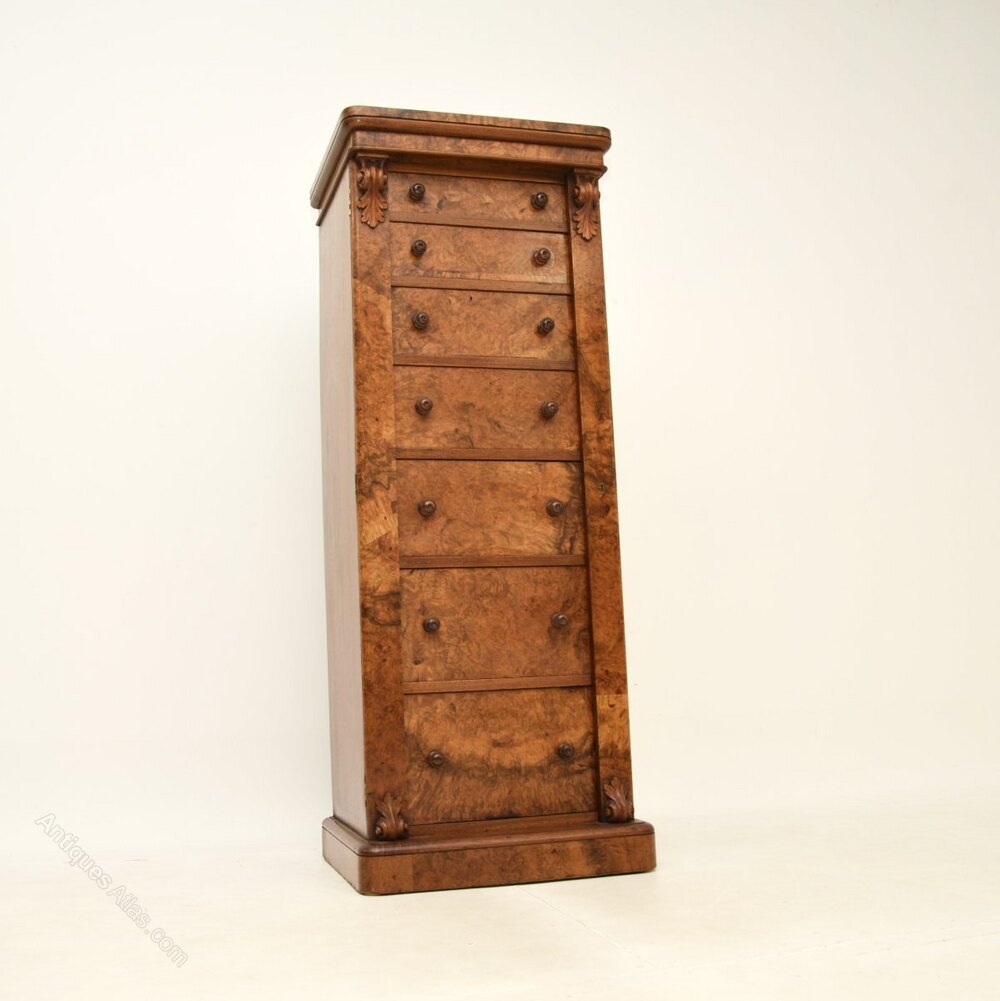 It is of absolutely amazing quality and is much larger than most Wellington chests, but still slim. It has stunning burr walnut grain patterns, beautifully turned handles and lovely carved corbels at the top and bottom. It has the usual locking mechanism seen on Wellington chests on one side, and an additional hinged flap on the other side due to its size. The drawers run smoothly and have fine, hand cut dovetailed joints.
