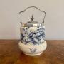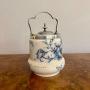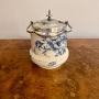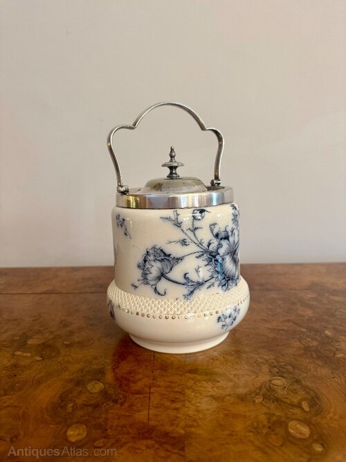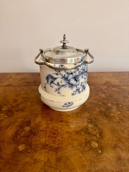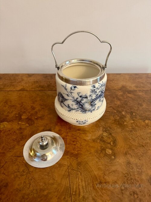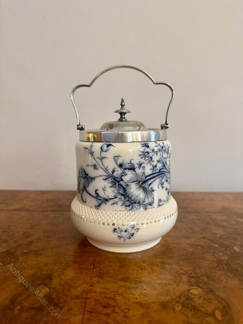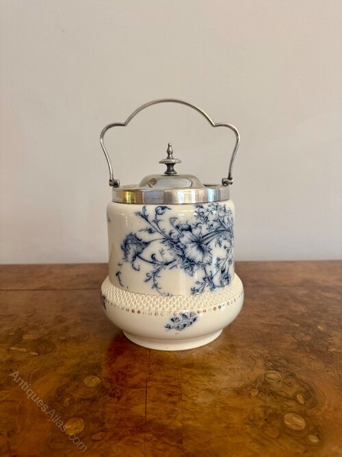 Beautiful quality antique Victorian Carlton Ware biscuit barrel, decorated with a pretty blue floral pattern on a white ground, above a raised lattice band with small bead detailing, with a silver plated removable lid with a decorative finale and a silver plated swing handle.
