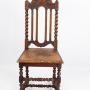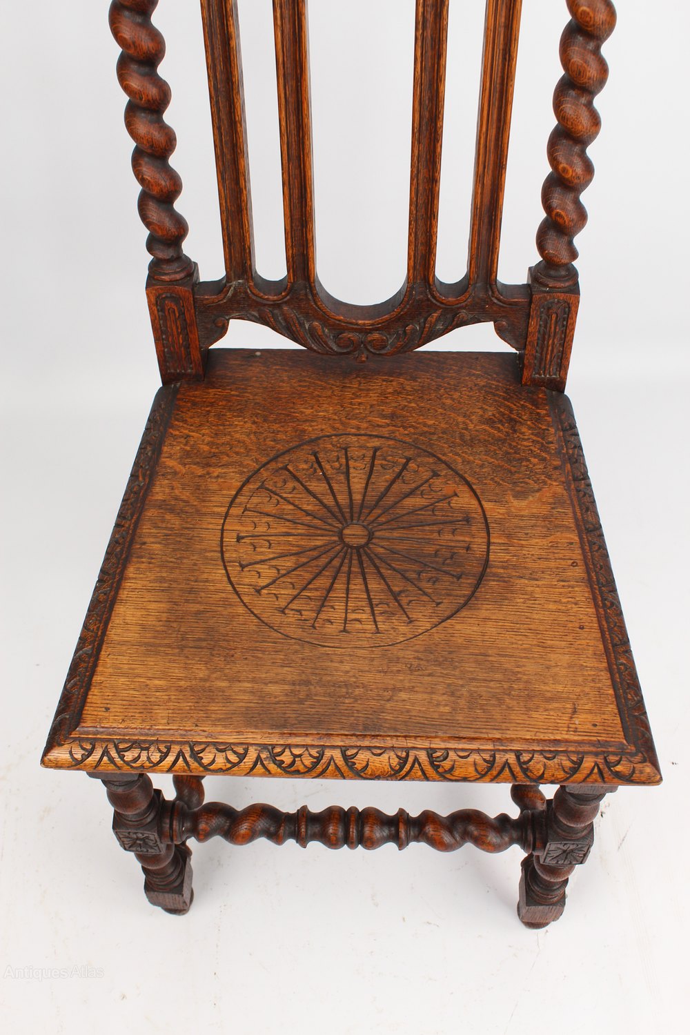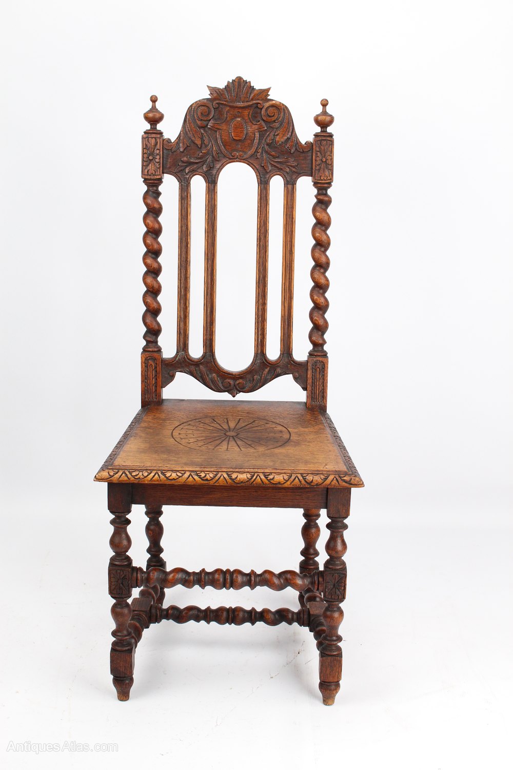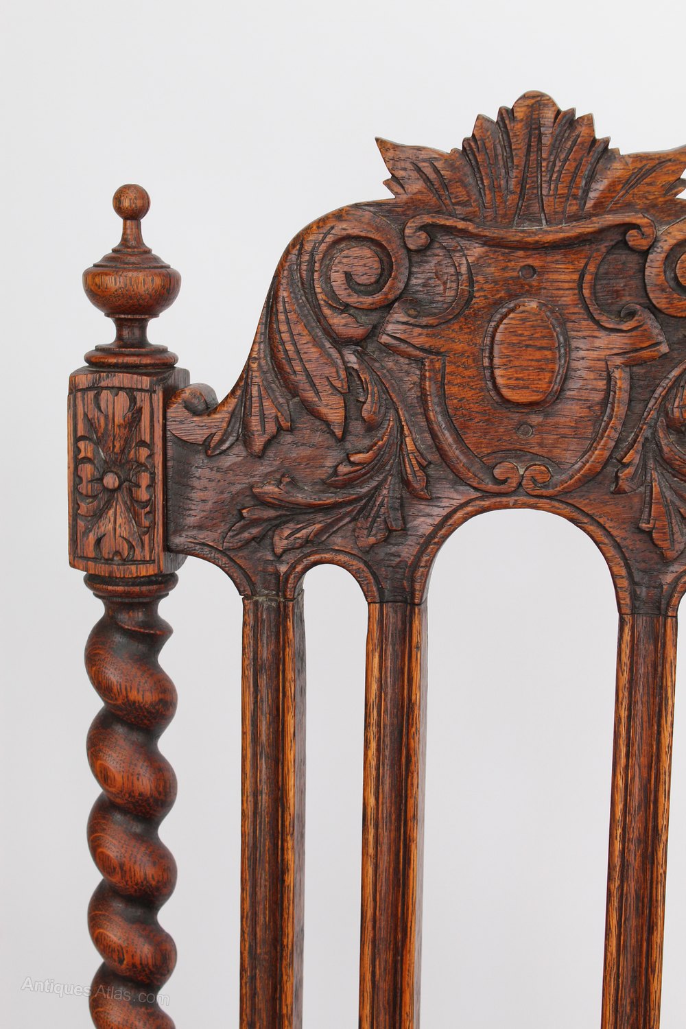 A very decorative antique Victorian Gothic chair in oak dating from circa 1895. With an elaborately carved top rail, the side supports are barley twist and topped with finials. The legs are on turned block supports and the stretchers are barley twist. It has a solid carved seat. Would make a wonderful dining or kitchen chair.