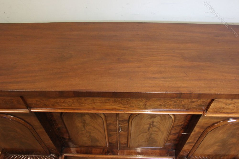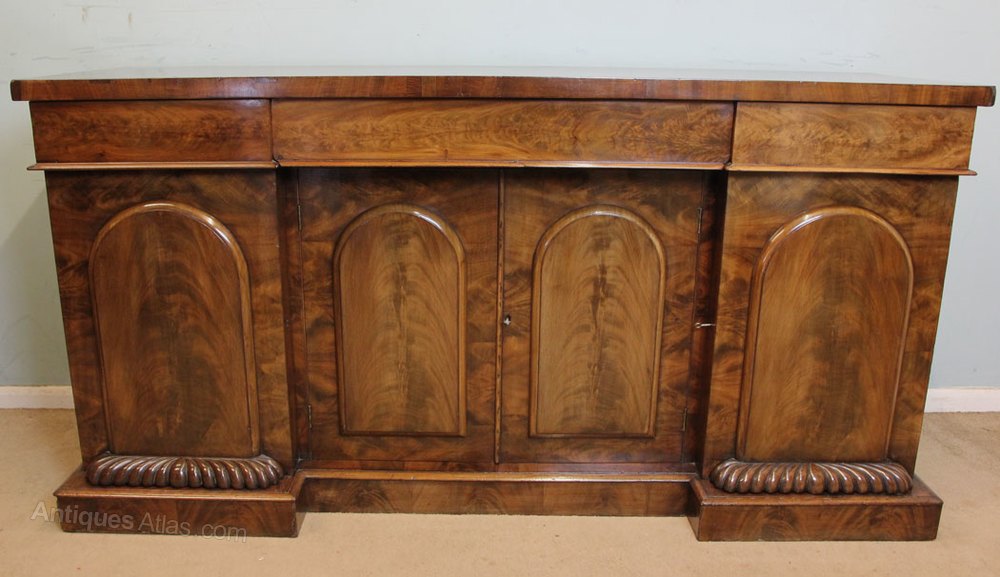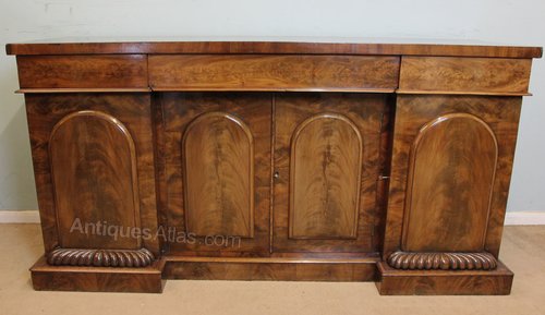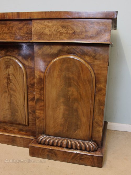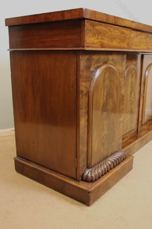 A Victorian mahogany breakfront sideboard / dresser base, having long drawer to the centre and two smaller drawers either side, under having large centre cupboard the interior having one shelf, having smaller cupboard either side the left hand cupboard has two slides to the interior the right hand side is fitted with a deep cellaret drawer and shelf. The sideboard has lovely raised arched panels fitted to the doors and figured mahogany fronts, the cupboards either side have lovely carved decoration under the door panel, all standing on a solid plinth base. with the usual age related wear and patina as always with antique furniture.