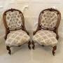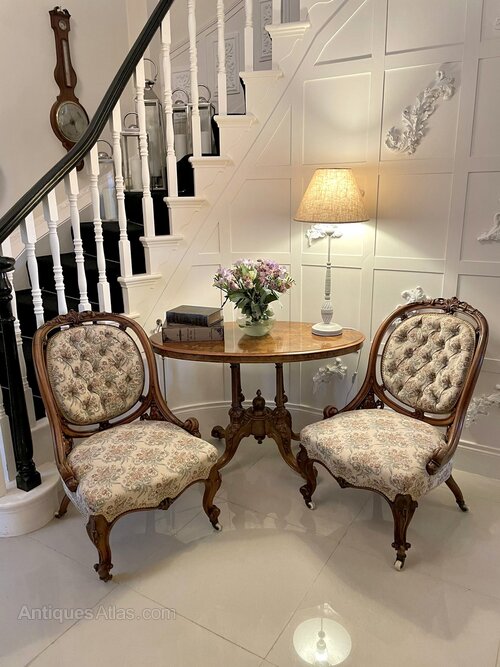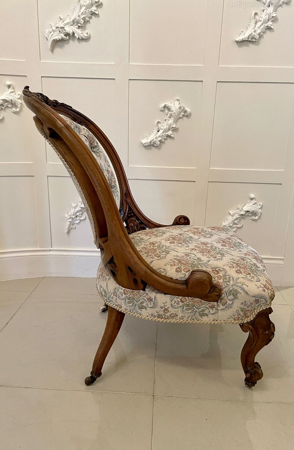 Outstanding quality antique Victorian pair of carved walnut chairs having outstanding quality carved walnut oval backs, carved walnut supports ,carved walnut serpentine shaped front rail and raised on shaped carved walnut cabriole legs to the front and out swept back legs with original castors.