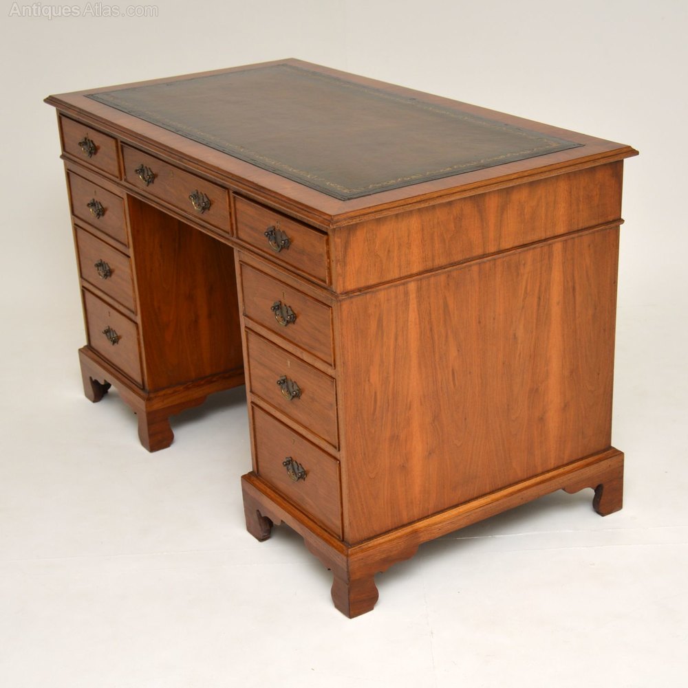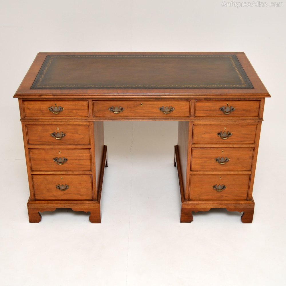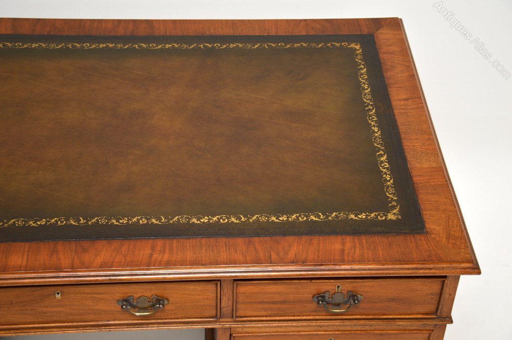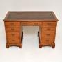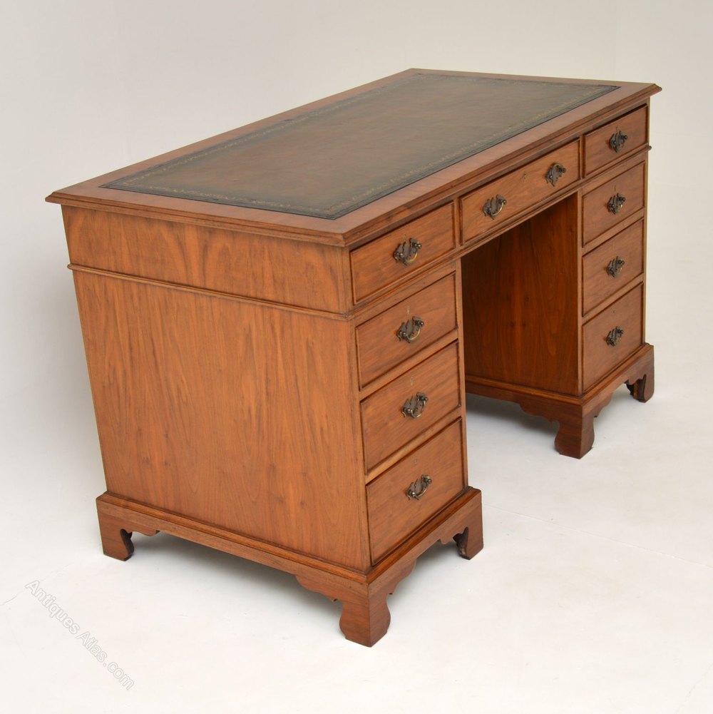It is really well made and is a lovely size. The colour and grain patterns are gorgeous throughout. This sits on bracket feet and has the original brass handles. It also breaks down into three pieces for ease of transport. The drawers are all graduated in depth & all have locks. The backs of the pedestals are panelled & this desk looks smart on the back too.