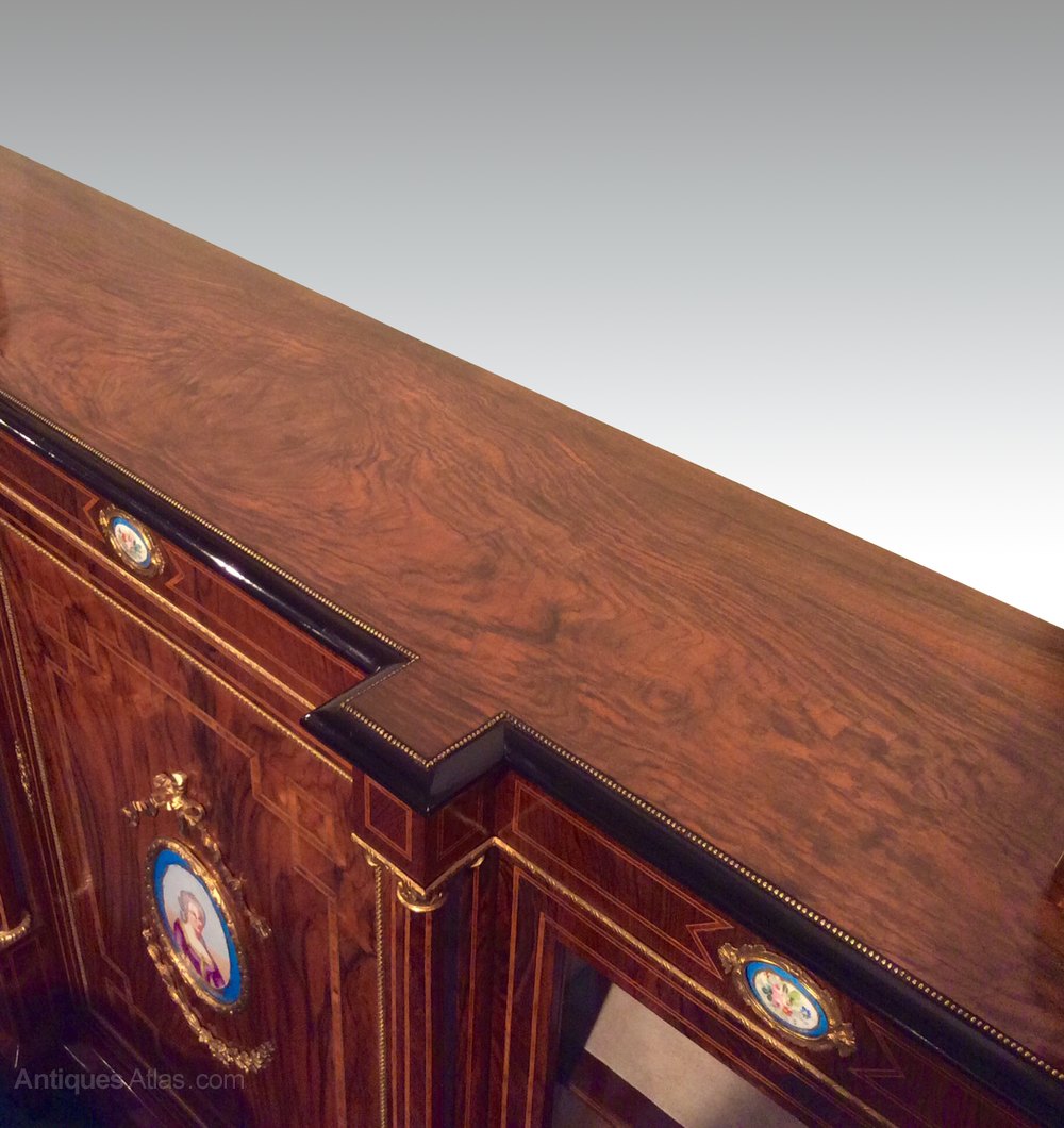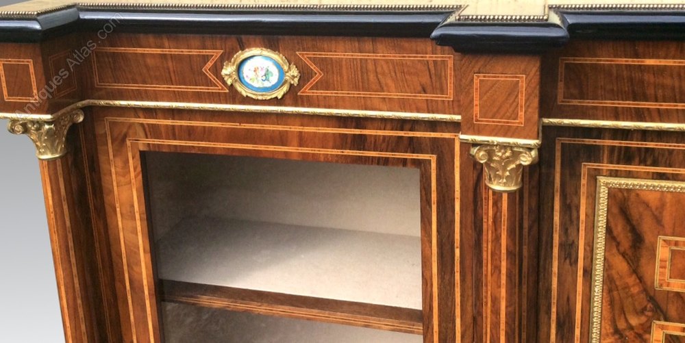 Stunning Quality Antique Victorian Figured Walnut, Ormolu Mounted Inlaid Breakfront Credenza Sideboard,Display Cabinet.circa 1860. It has elegant glazed doors on either side and a central panelled door which is adorned with a hand painted Sevres porcelain plaque and ormolu swags.There are three similar plaques in the frieze, which are further decorated with exquisite ormolu mounts. The Inlaid glazed side doors open to reveal two Inlaid shelves in each section, ideal for displaying your collectables, the central door opens to reveal a central shelf and plenty of storage space for glasses, crockery, etc,. The interior has been relined in an elegant beige velvet.