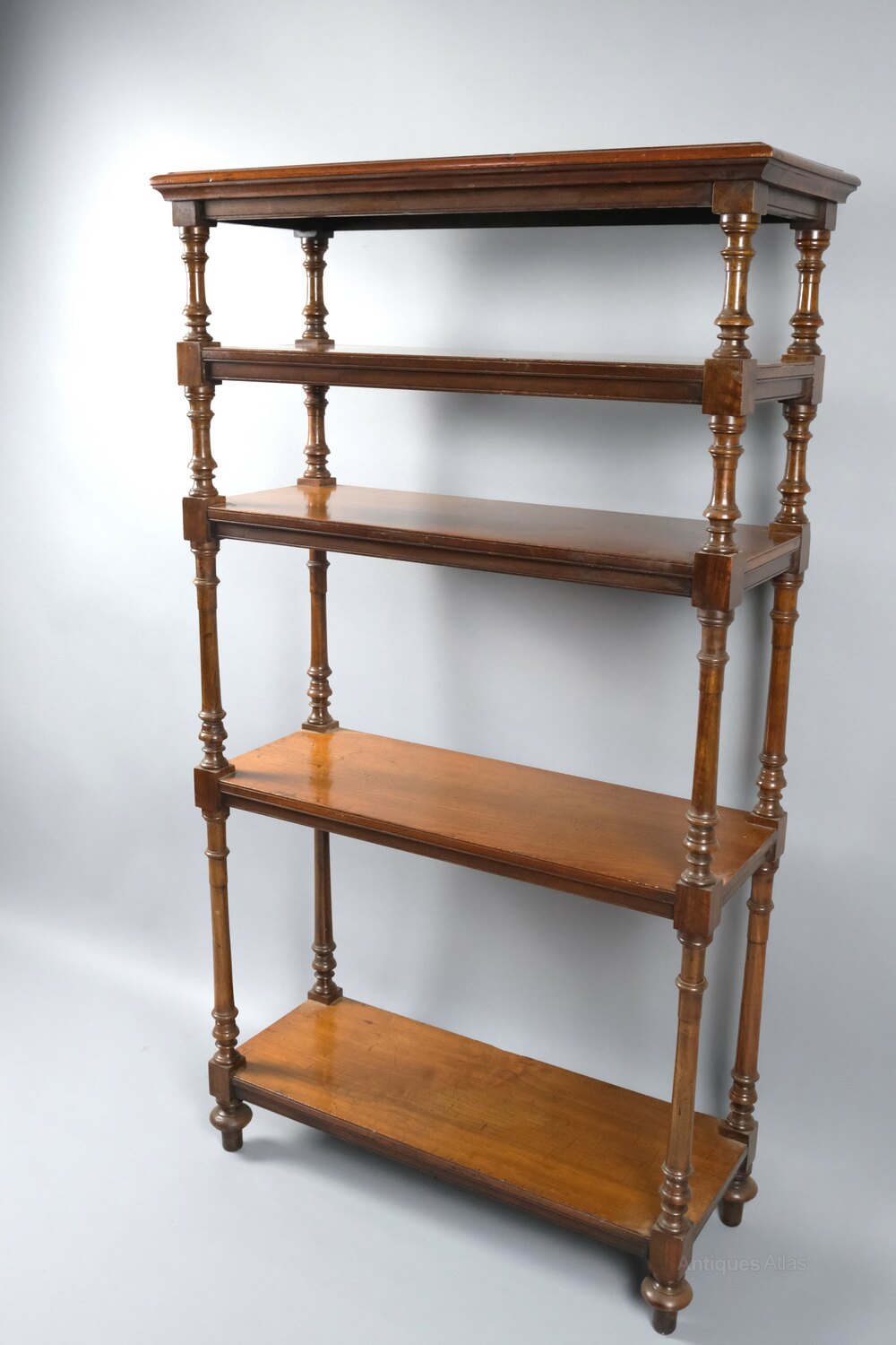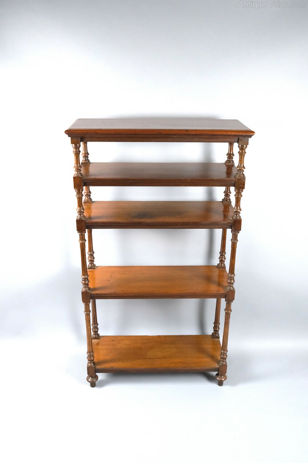 The whatnot features five finely crafted tiers, each elegantly connected by graduated columns that add a sense of grace and refinement to its overall design. The turned feet provide stability and a touch of vintage charm. This exceptional piece is not just a practical storage solution but also a true work of art, blending functionality with the artistic craftsmanship of the 19th century.