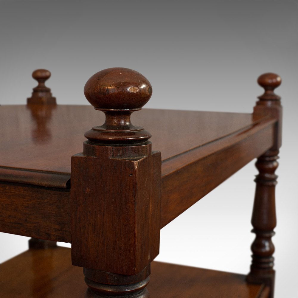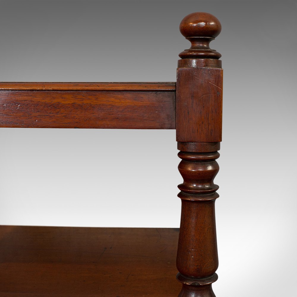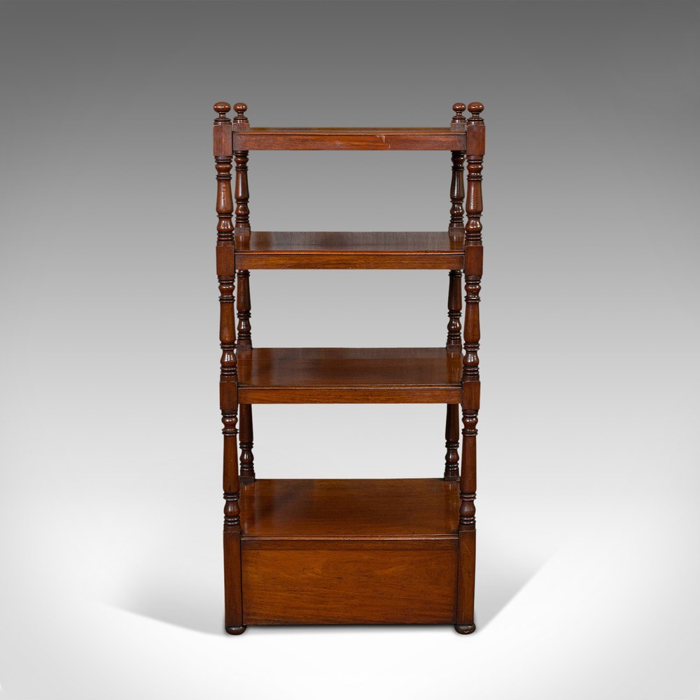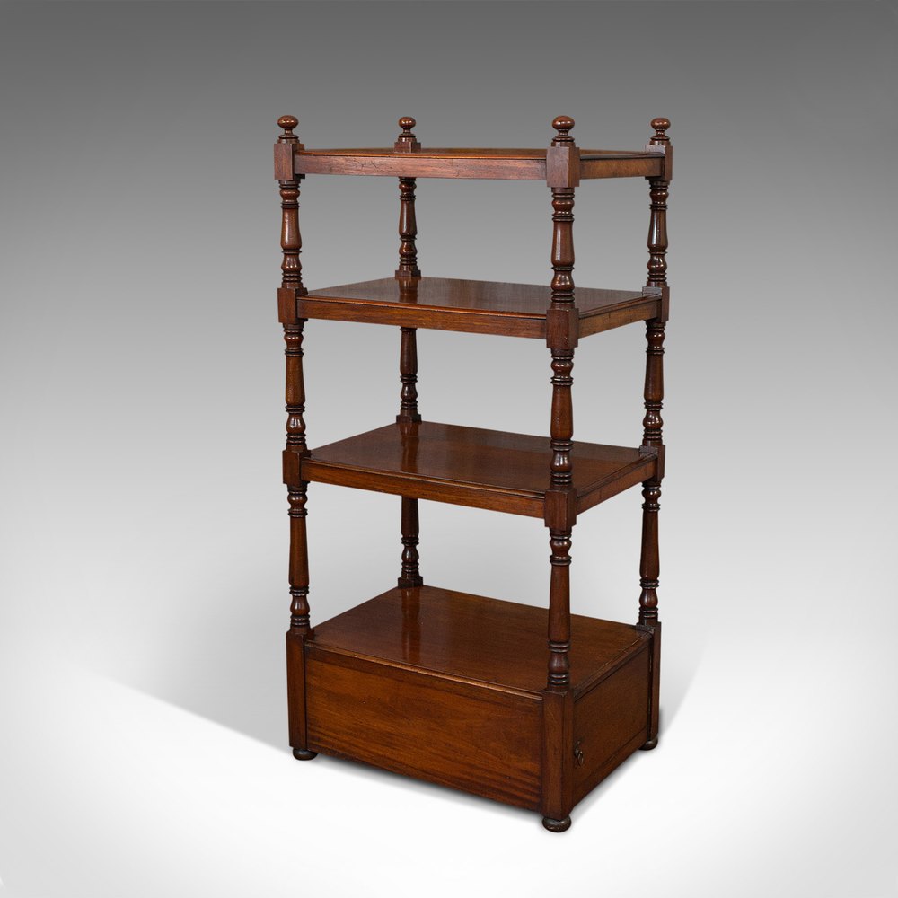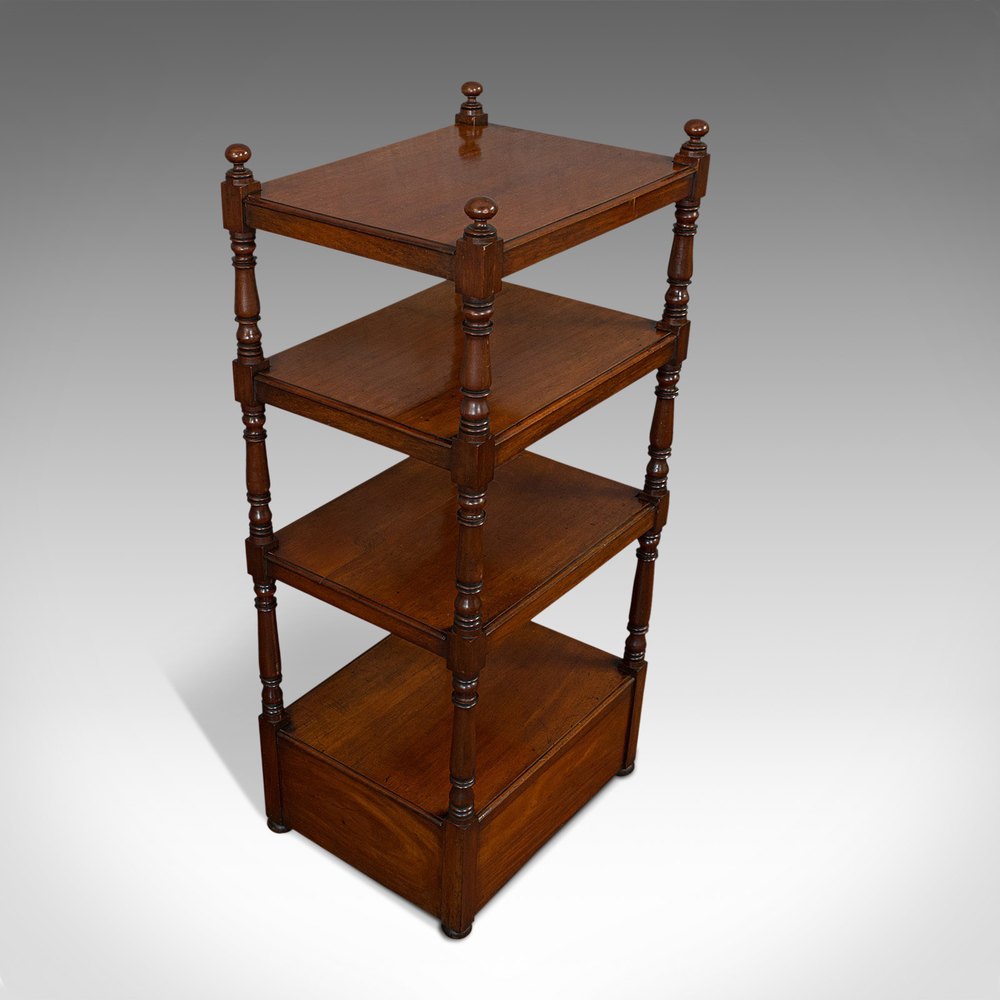 This is an antique whatnot. An English, mahogany four tier display stand, dating to the early Victorian period, circa 1850.