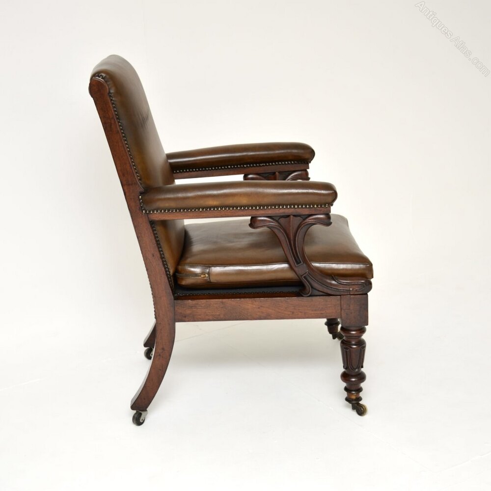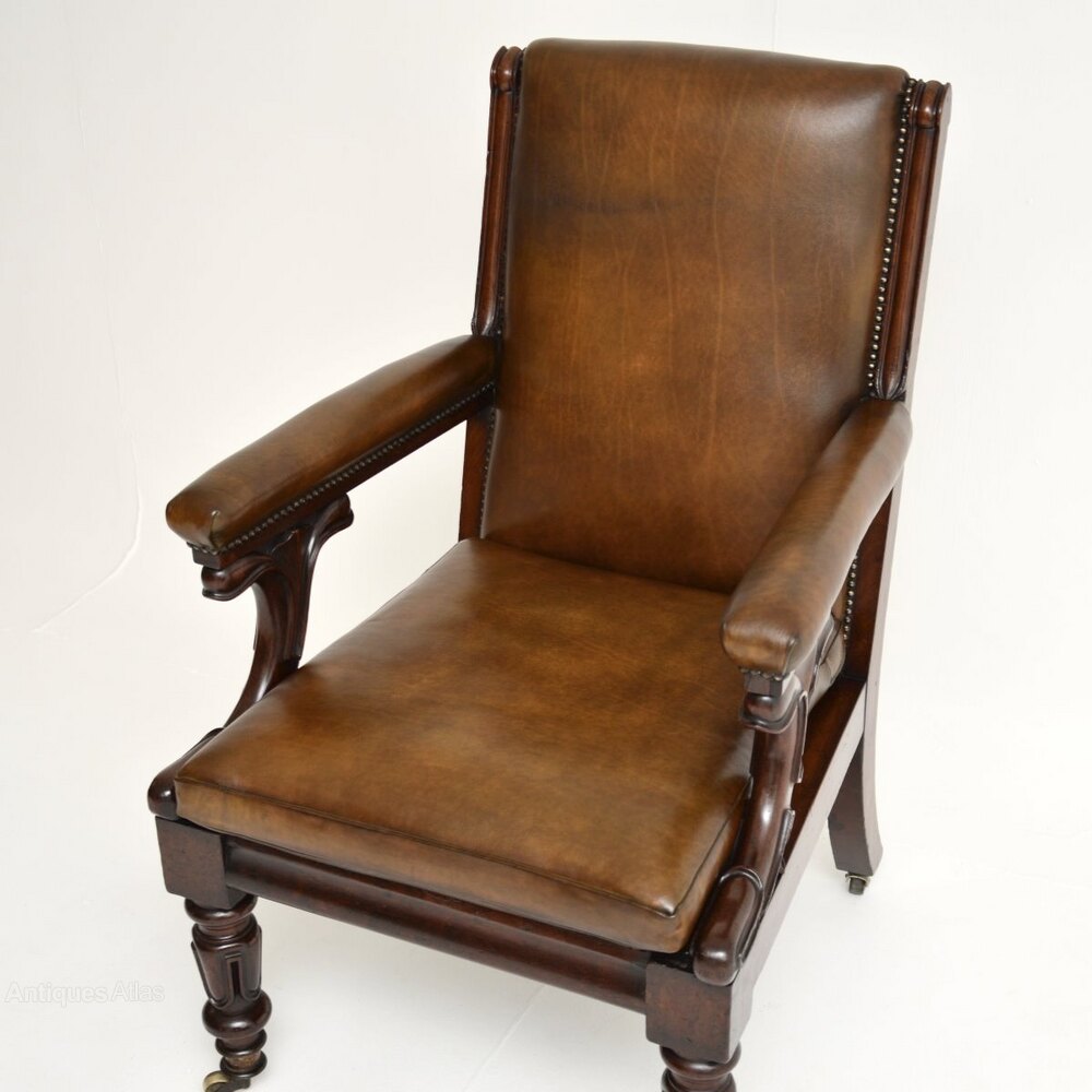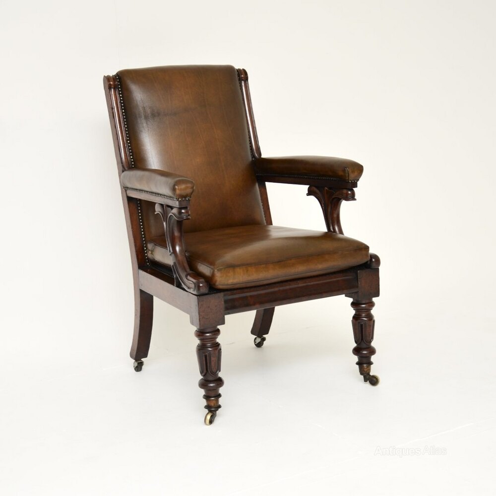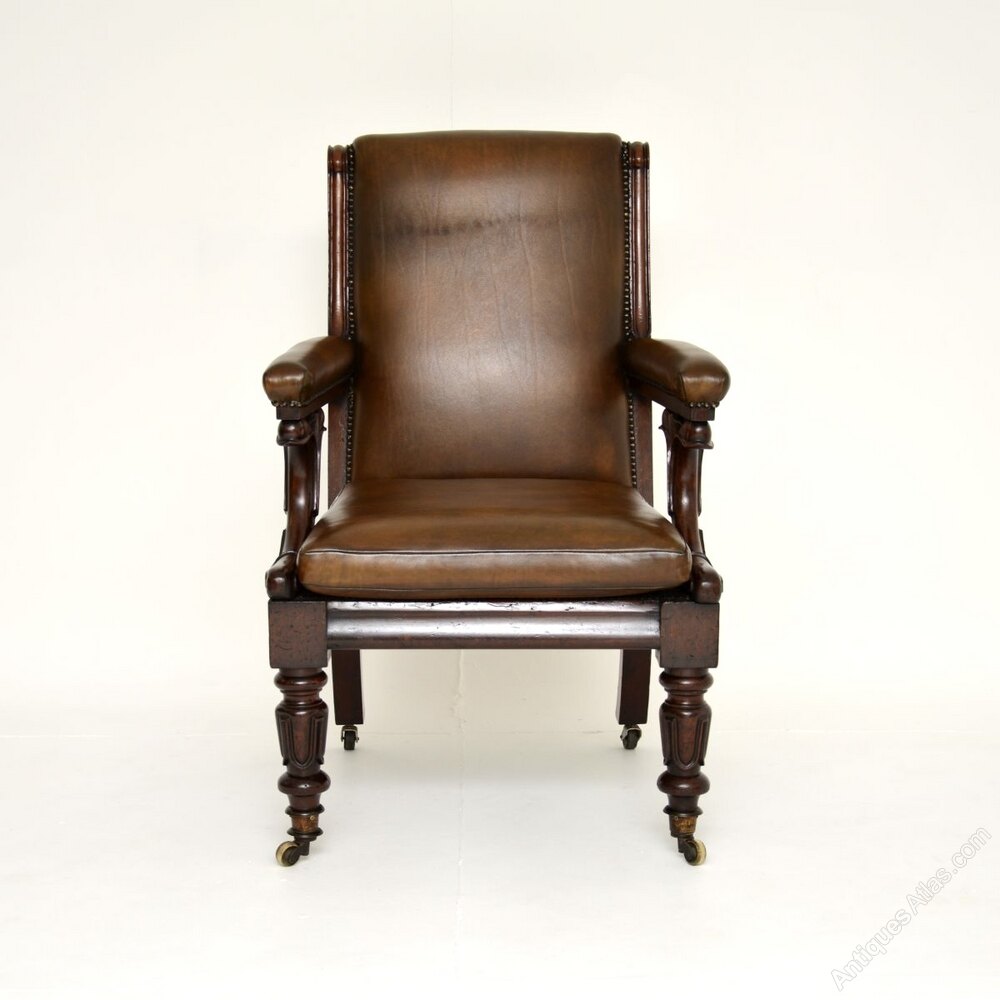 An exceptional antique William IV mahogany and leather library armchair. This was made in England, it dates from around the 1830-1840 period.