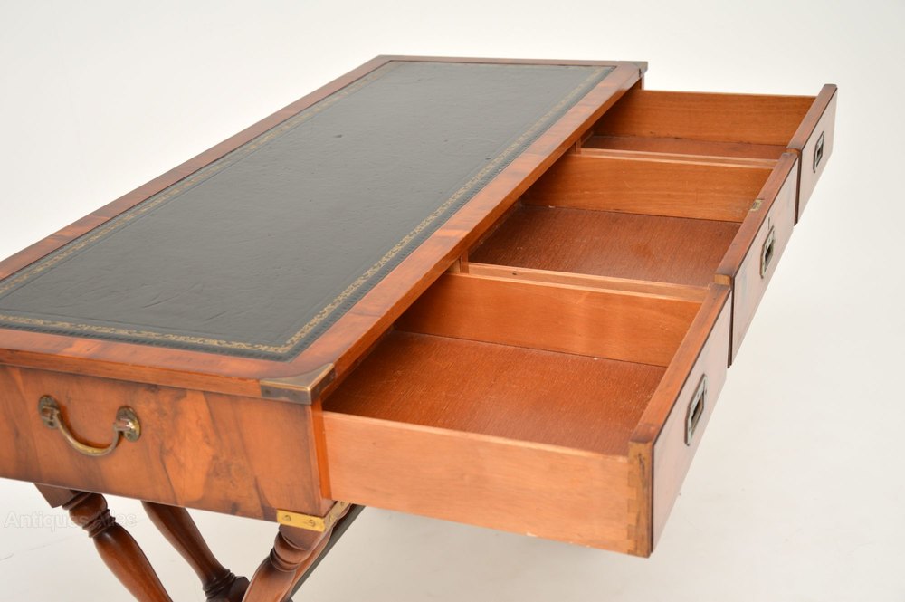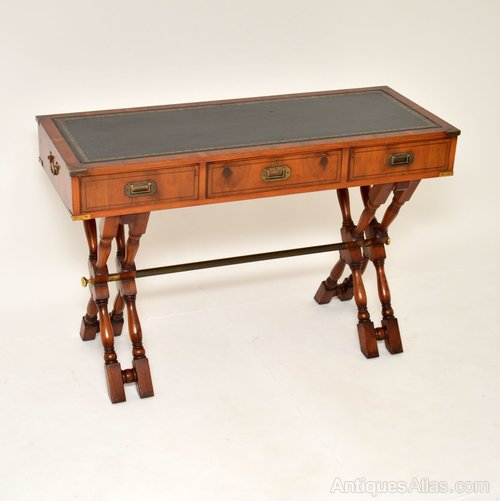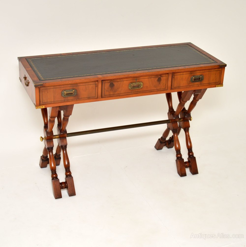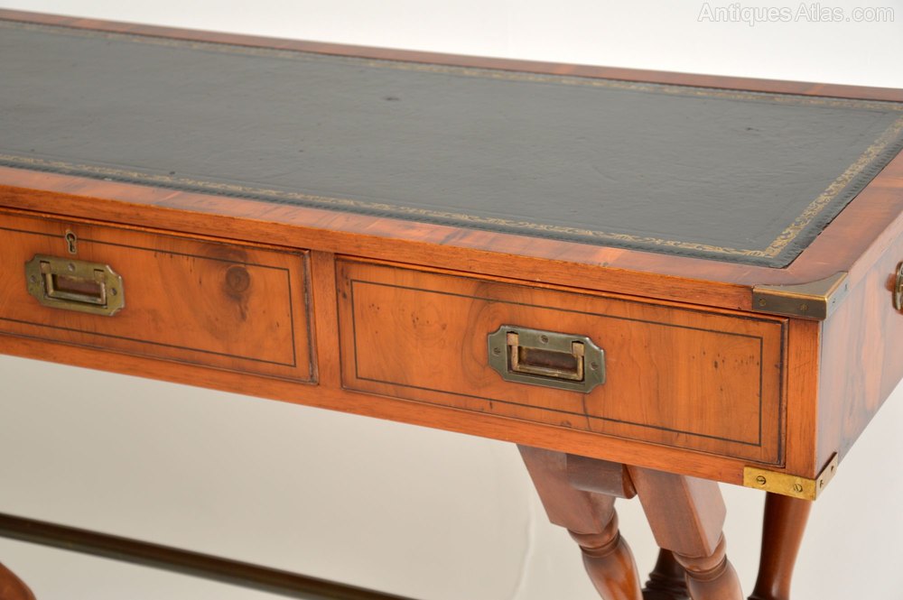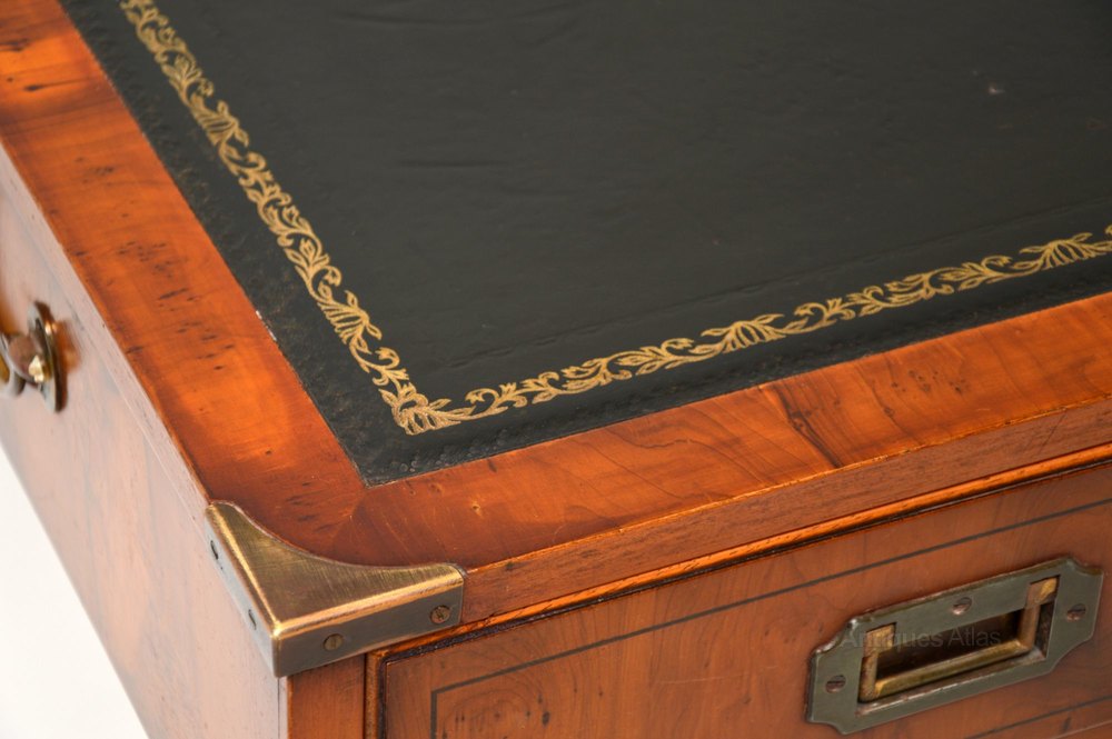 A smart and extremely good looking yew wood desk in the antique military campaign style. This was made in England, it dates from around the 1930’s.