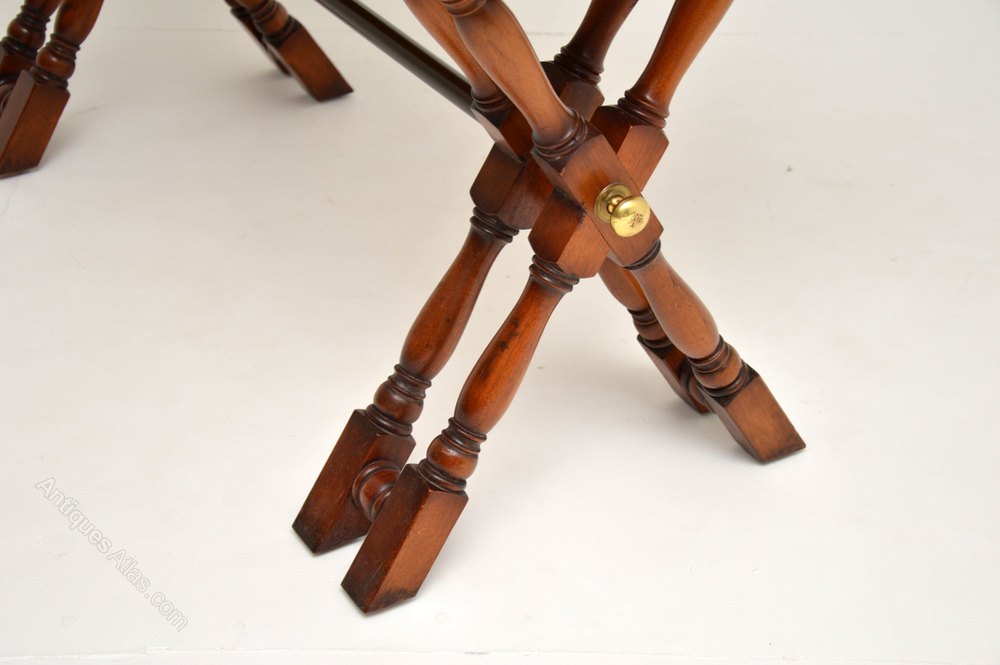 The base has a striking X frame design, with a solid brass stretcher, the legs are beautifully turned from solid wood and are doubled up on each corner, giving this extra stability & a great look.