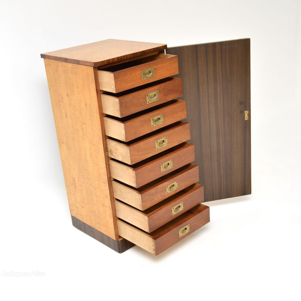 This is of outstanding quality, its a great size. It looks like bedside cabinet size in the images, but in reality it is much taller, offering lots of storage space within the eight internal drawers. This is predominantly birds eye which has a gorgeous colour tone, it contrasts beautifully with the darker walnut banding on the top and lower edges.