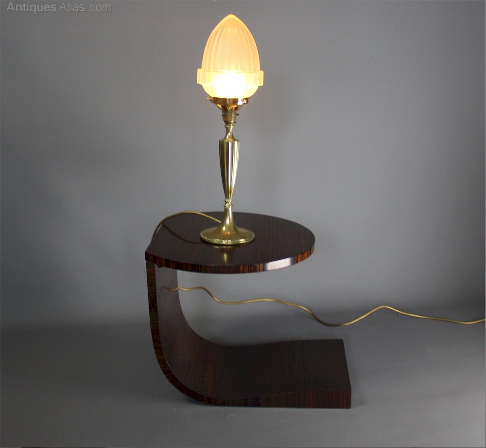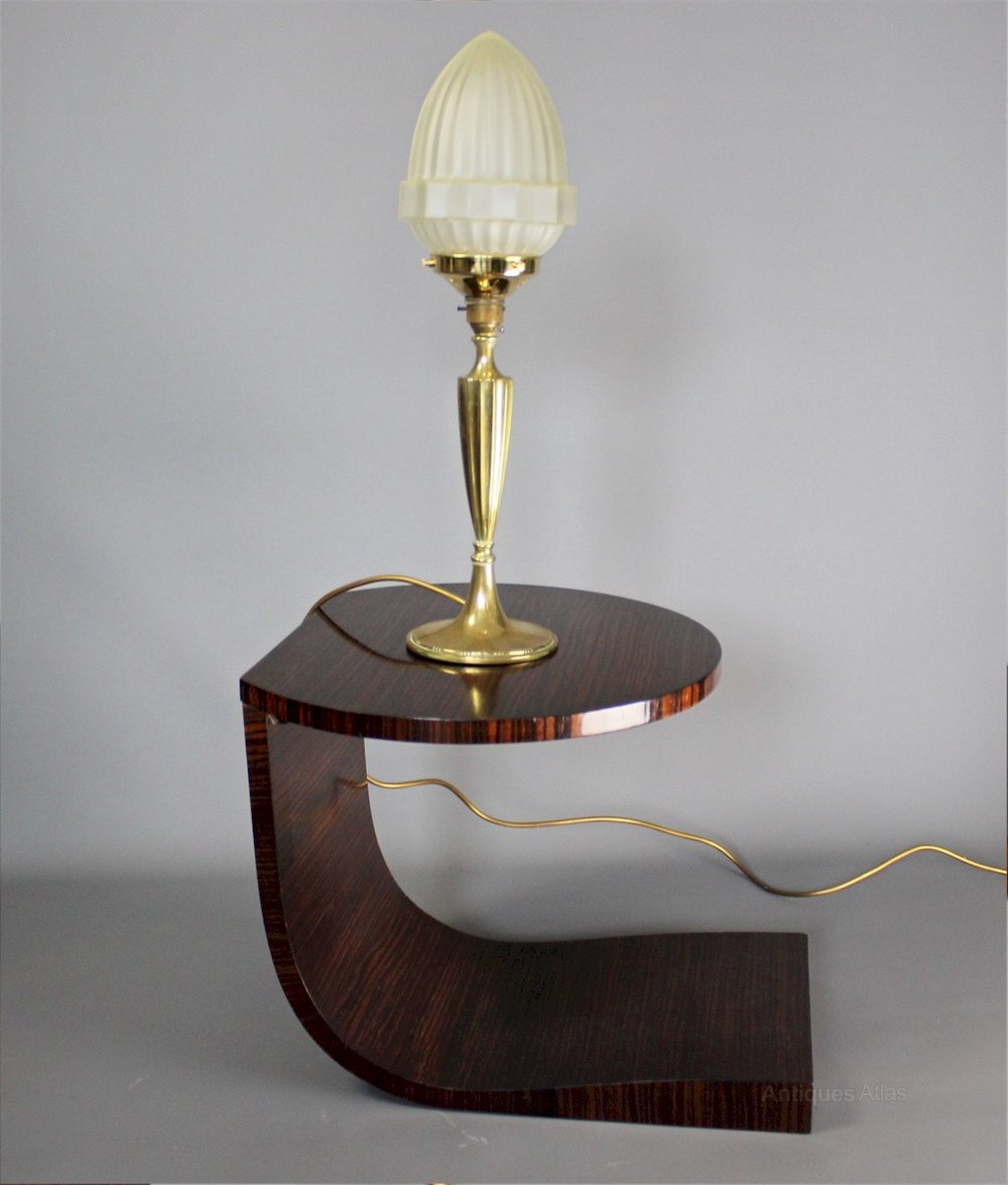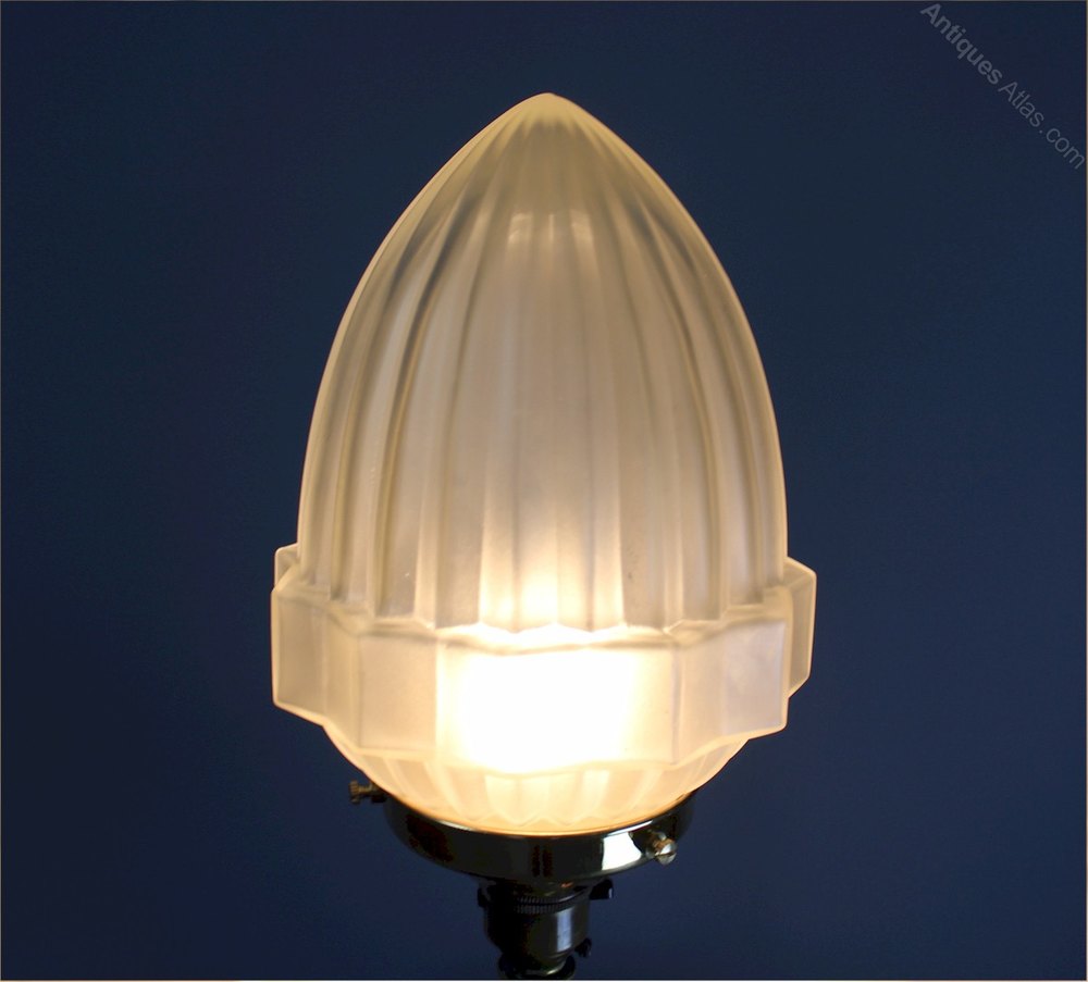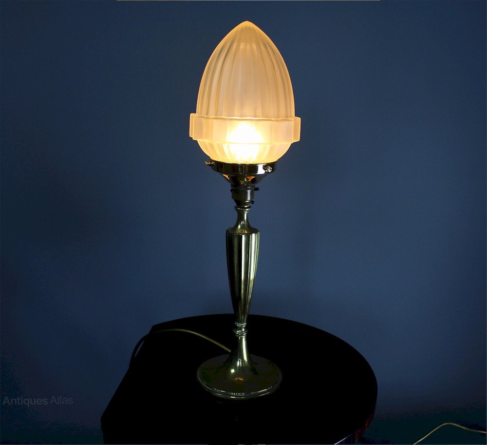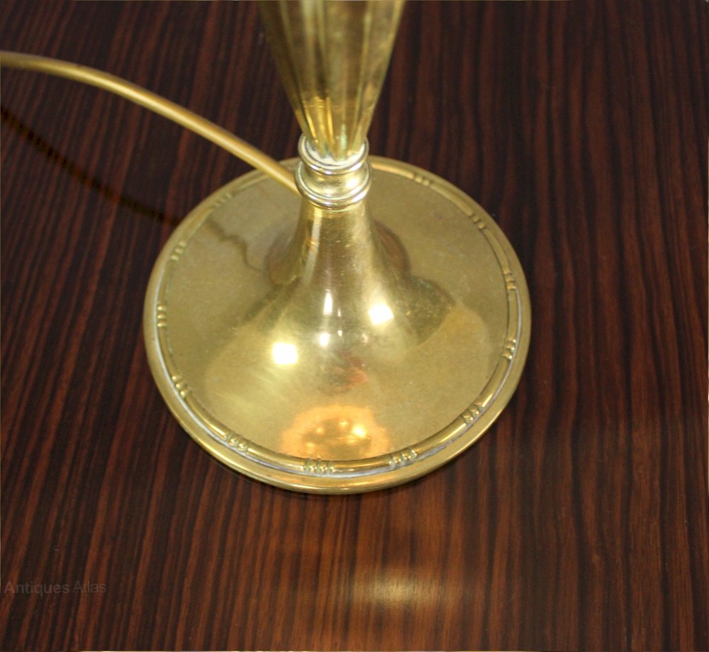 Art Deco brass fluted table lamp with matching fluted shade. Comes with PAT test. Measures 49 cm x 11.5 cm diam