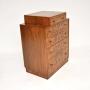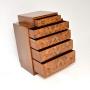 It is a lovely size and is of superb quality. There are incredibly beautiful burr walnut patterns, there is lots of storage inside the generous drawers. This sits on an banded walnut plinth base, it has a stepped top section and beautifully crafted nickel handles.