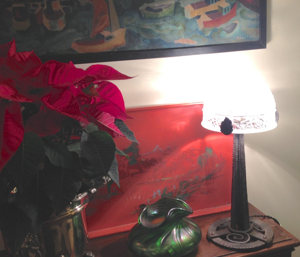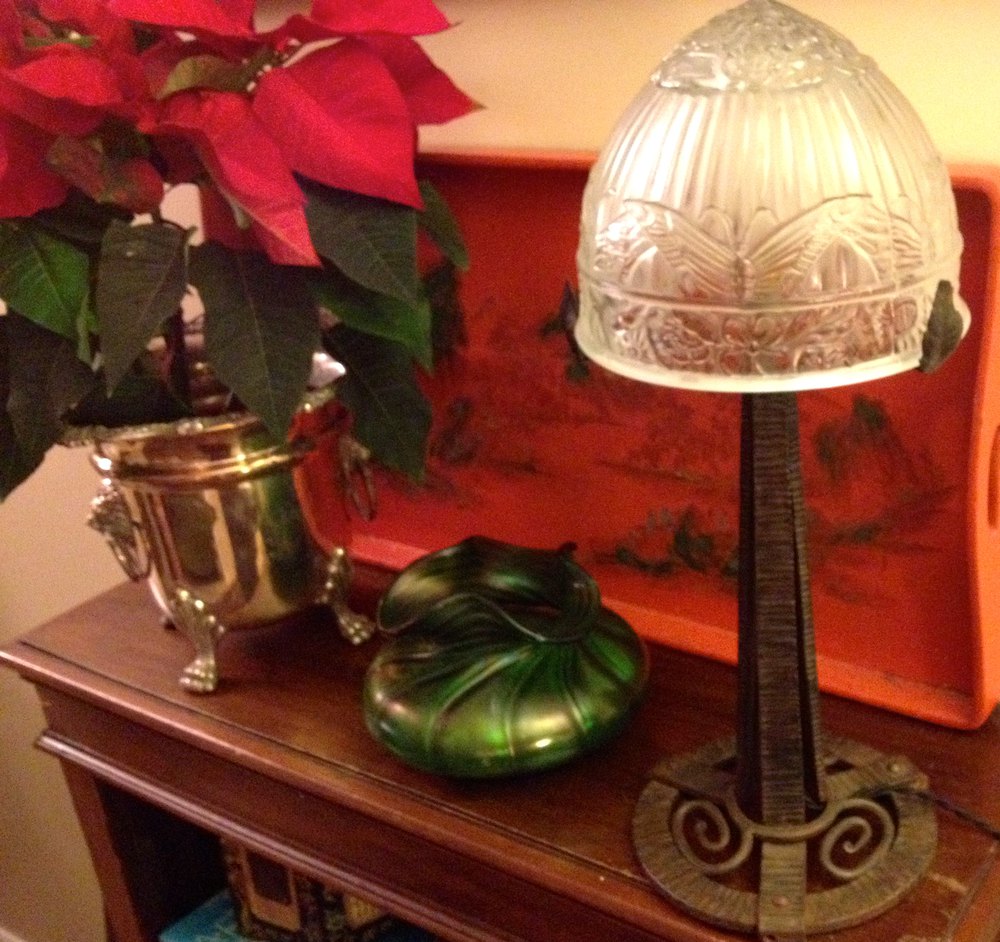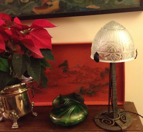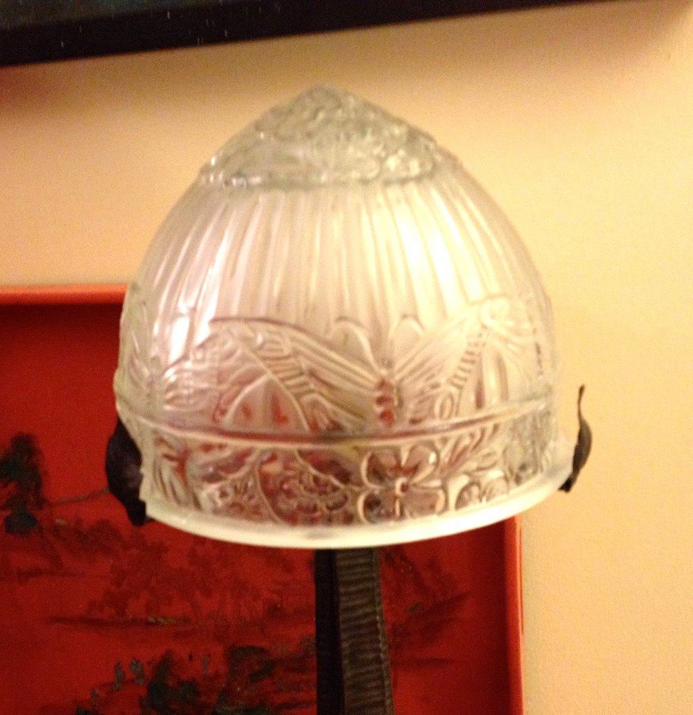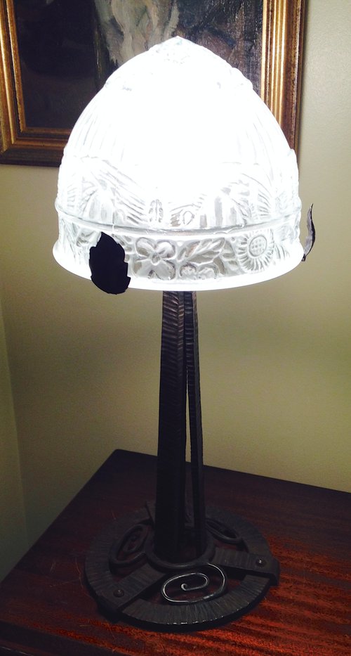 Pure Art Deco and its glamourous era....... Fer Forge and Pate de Verre Dome best describe this versatile table lamp at home on your consol table as on your desk or side table.