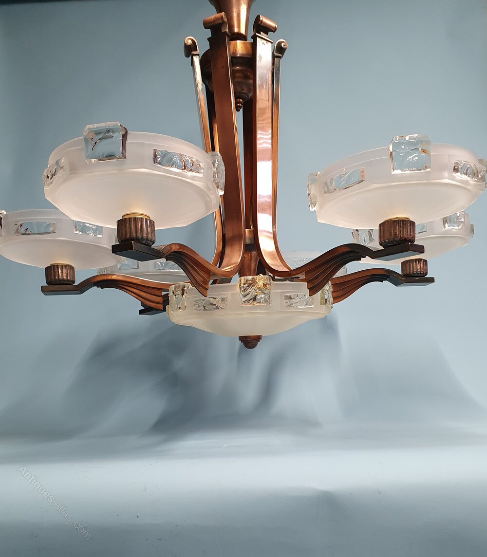PETITOT PARIS art deco chandelier in copper and glass. This piece has a copper body with C scrolls to the top of the arms. The arms have blackened ends which gives the piece depth. They also have a wing to the underside of the arm. The glass is lovely quality with a classic shape. This piece comes with a rose and chain measuring 14cm. Comes with seven large bayonet bulb holders (B 22) one of which points down.