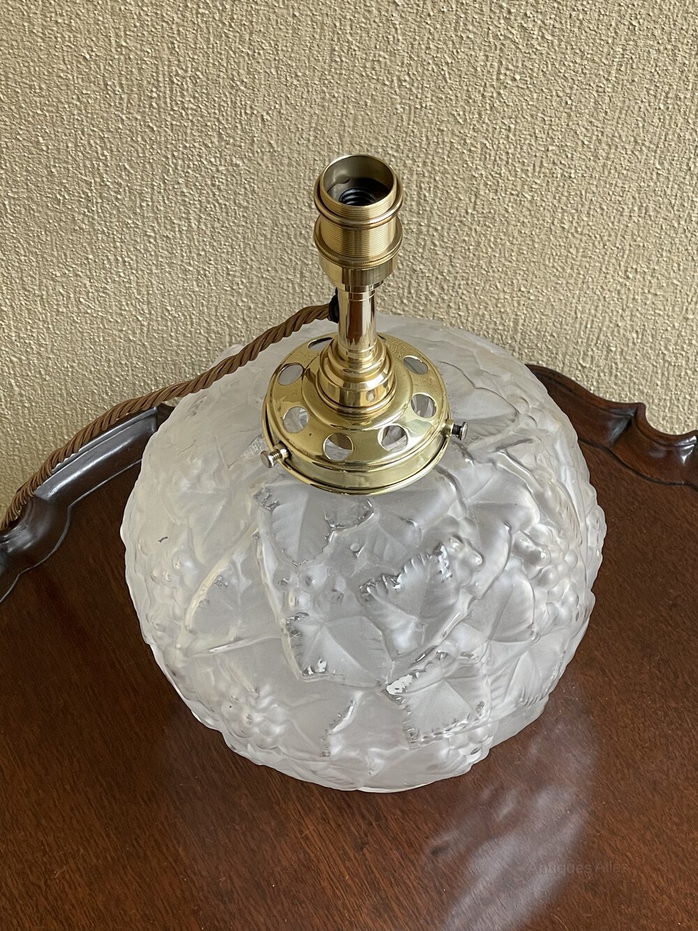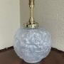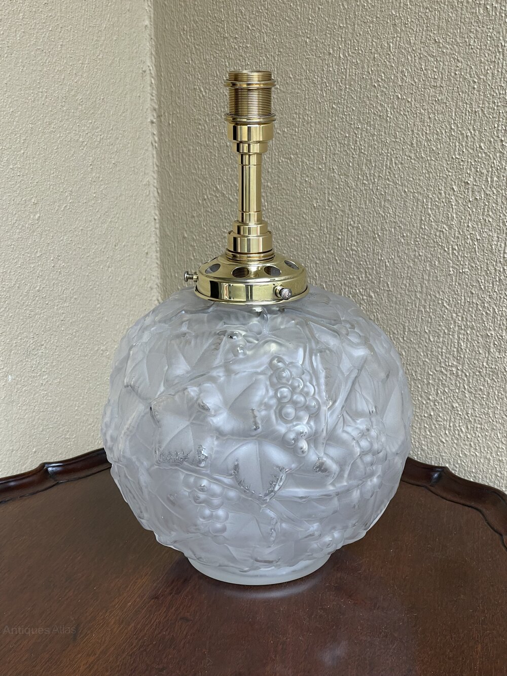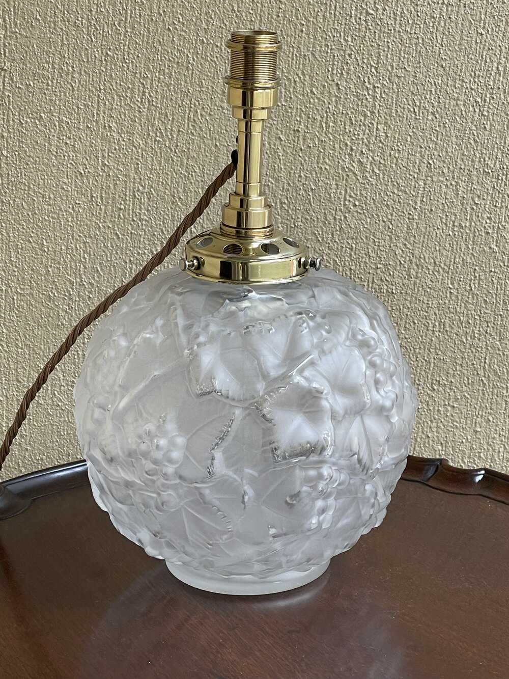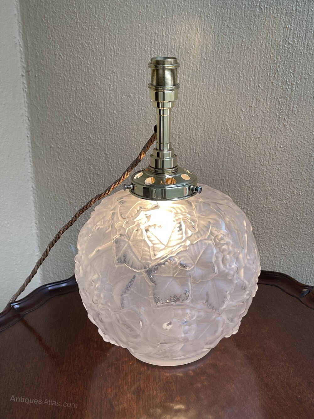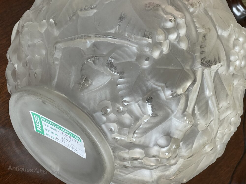 A beautiful Art Deco cast glass table lamp, in the style of Lalique. French. The pretty glass body all over decorated with grapes and vines. Fully rewired in period style braided flex, PAT safety tested and fitted with internal and external bulb with dual switch. The internal bulb gives a beautiful ambient light when illuminated.