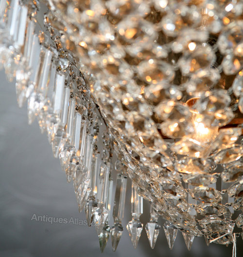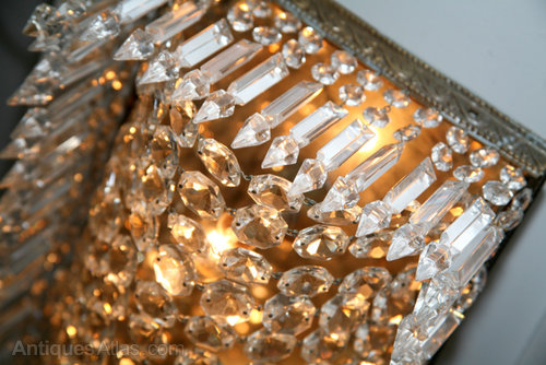 I am selling these beautiful Italian Art Deco chandeliers simply dripping with cut glass Albert droplets and cut glass octagons. There are two lamp holders in each and they hang close to the ceiling from two ceiling hooks.