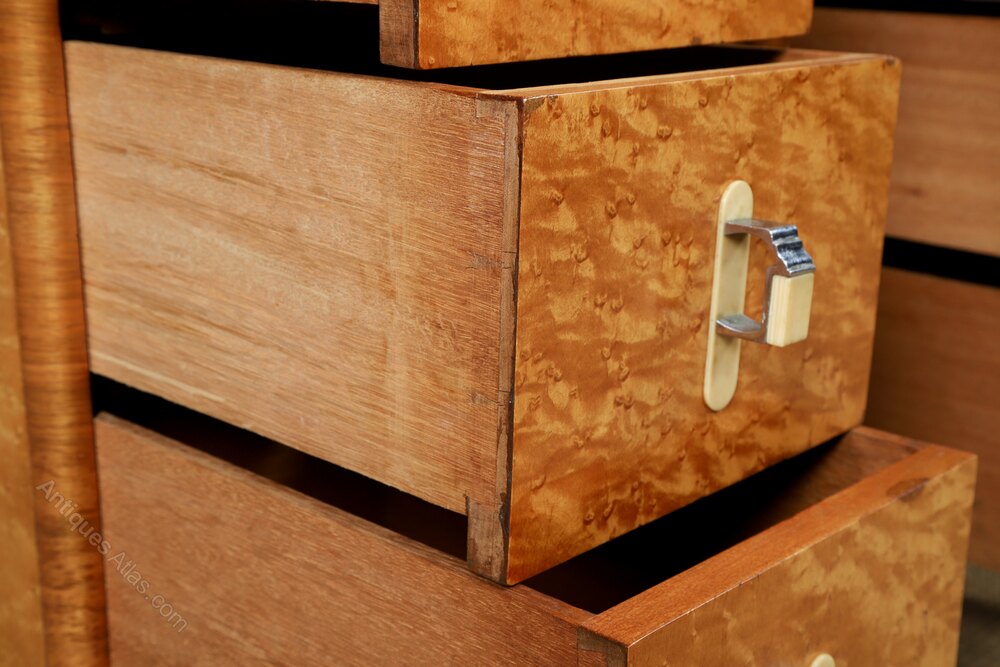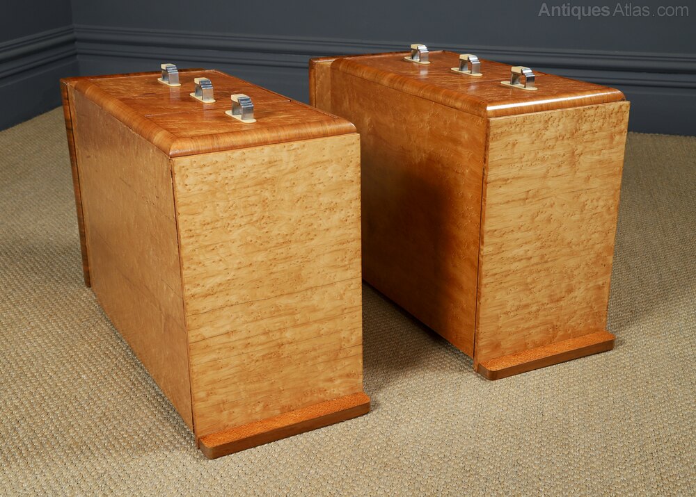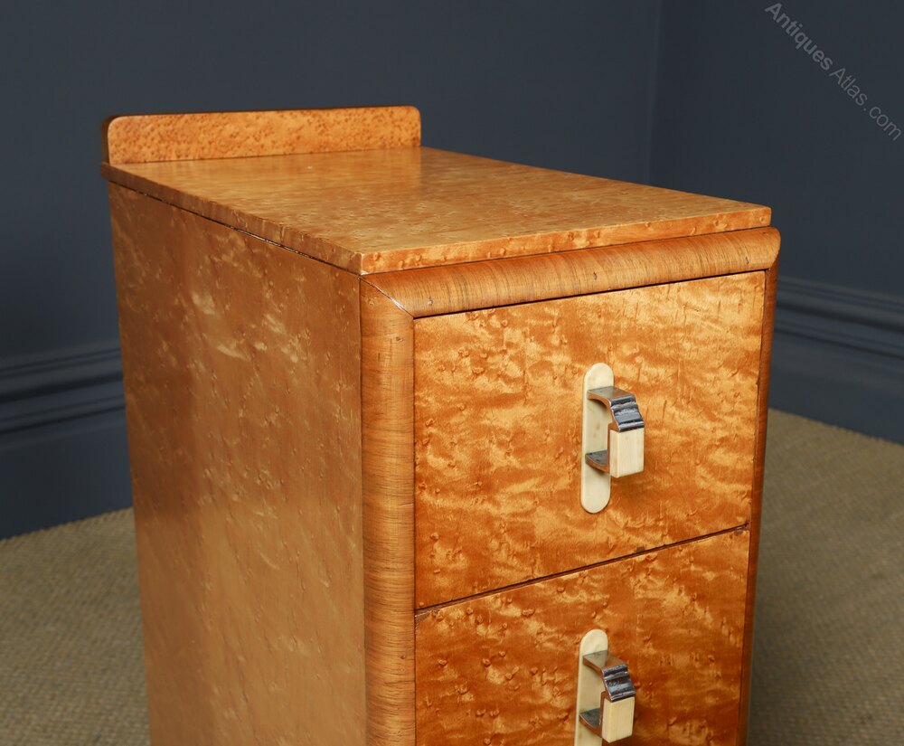 Condition This is a fine quality pair of antique English Art Deco nightstands, constructed from stunning mirror-matched birds eye maple and walnut, comprising three drawers, circa 1930, in excellent condition. They are pedestals from an Art Deco dressing table, which have been adapted into bedside chests. The Art Deco bedside tables have been cleaned and French polished by hand to a professional standard in our workshop, therefore the finish is in excellent condition. Nominal old use marks to the leading edges, sides and inside the drawer bottoms, but nothing significant considering the age of them. The drawers are well constructed, run freely and close flush to the frame and retain the original handles. These Art Deco chests are well constructed, solid in joint and ready to use.