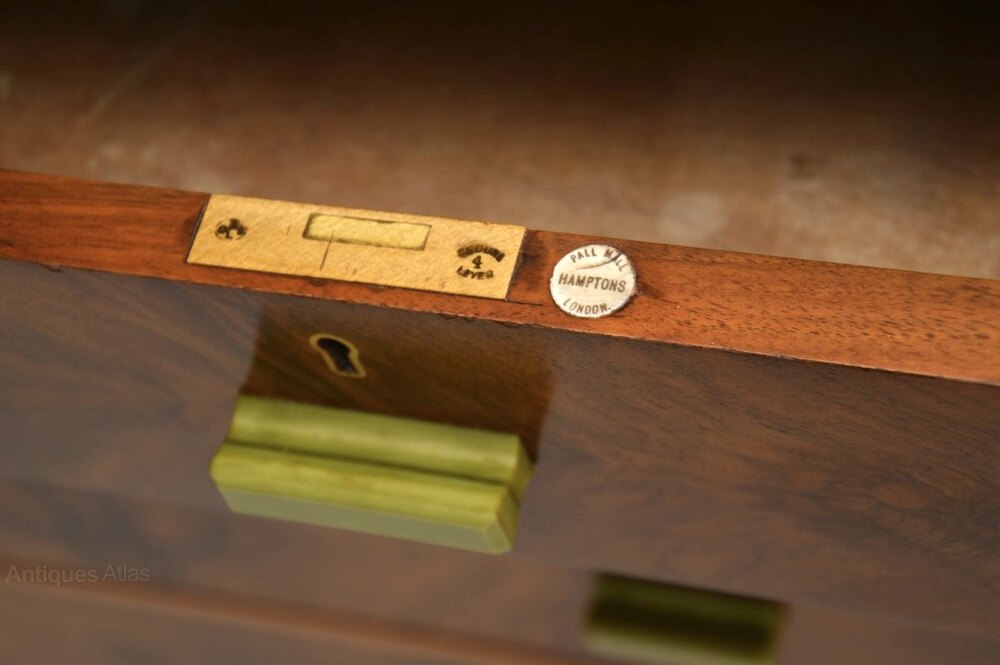 Hampton’s of Pall Mall were known for antique furniture of exceptional quality, and this is no exception. It is beautifully crafted, with stunning figured walnut grain patterns and colour tones. It is a lovely size, fairly low, yet with plenty of storage space in the generous drawers. The drawers all run smoothly, and have beautiful and very unusual green Bakelite handles. The makers badge can be seen in the top drawer.