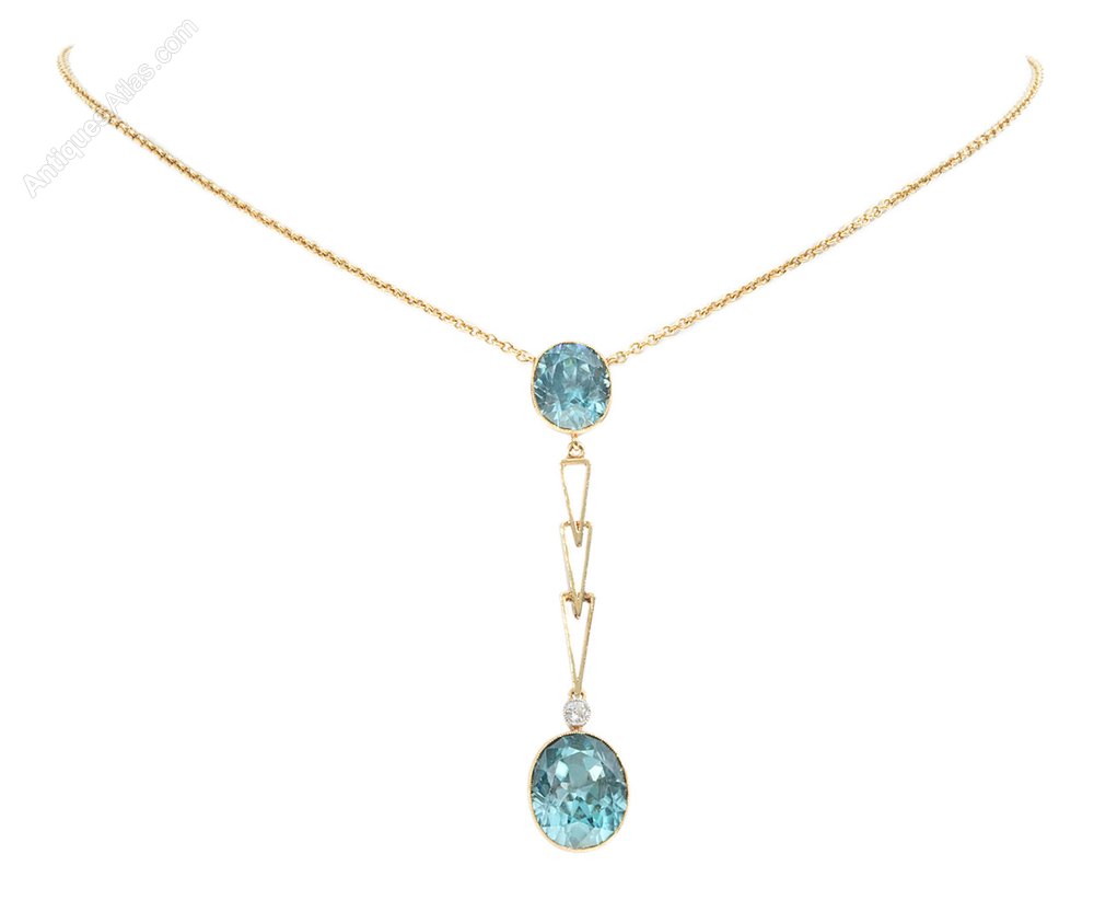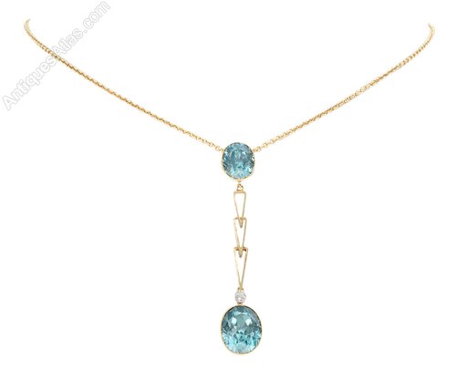 This smart pendant has a Zircon approximately 2.70 carats and another Zircon approximately 4.30 carats Zircons are the only coloured gemstones that refract the light like diamonds .The tiny diamond is approximately 0.05 carats and that is set in platinum ( marked on bottom setting) The zircons and chain are all 15 carat yellow gold. The drop measures 1 3/4 inches ( 5 cms ) and the chain is 16 inches in length ( 41 cms) Weight 5.22 grams