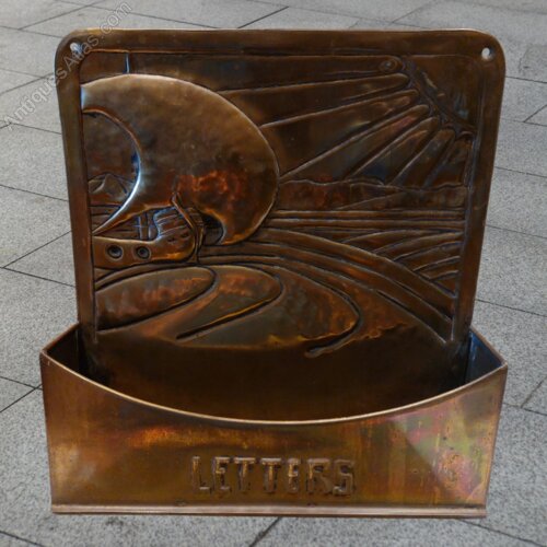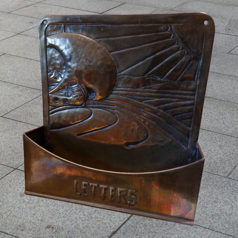 A lovely Arts and Crafts repousse brass wall letter pocket or letter rack. Dating to circa 1900. Decorated with a Galleon at sail. A very Celtic look about it and is probably Scottish. Presented with the original unpolished finish intact. Two holes at the top to secure to the wall. Very good size to take large letters at 10 7/8" wide x 11 3/8" high x 2 1/2" deep. The word LETTERS embossed on the front. Very good usable condition.