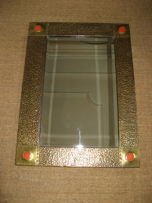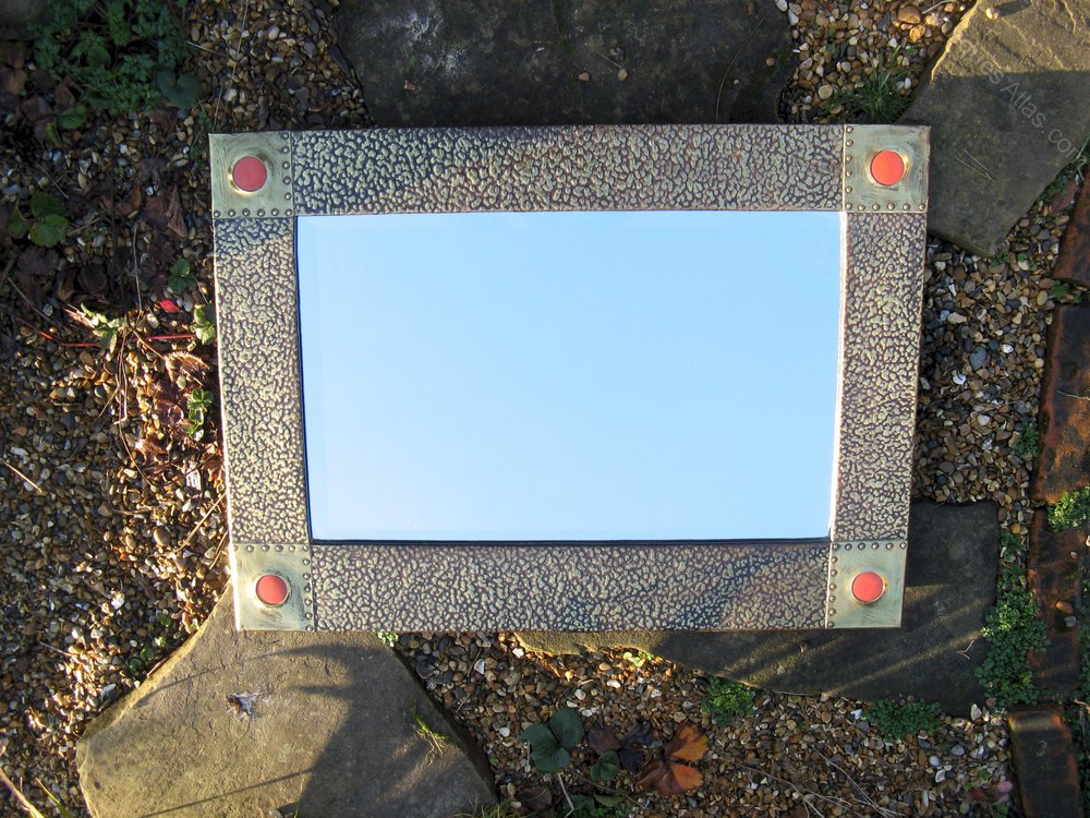 Large arts and crafts hammered brass framed mirror with orange Ruskin type roundels to each corner. Can be hung portrait or landscape. Measures 30.25 in x 22 in . Good overall condition . Replaced bevel plate.