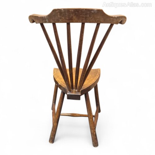 A very charming, stylish and neat late 19th Century/early 20th Century elm and beech Arts and Crafts fan back chair circa 1910. It is distinctively styled and aesthetically very pleasing having a shaped cresting rail and the partially overlapping spindles individual to this design of chair. It is supported with an H-stretcher.