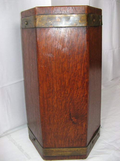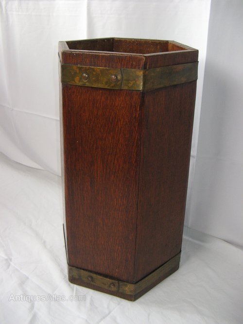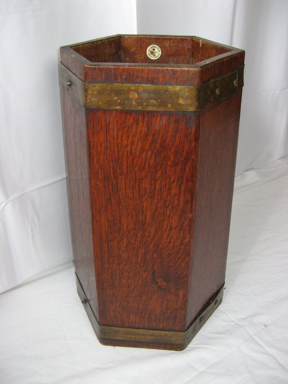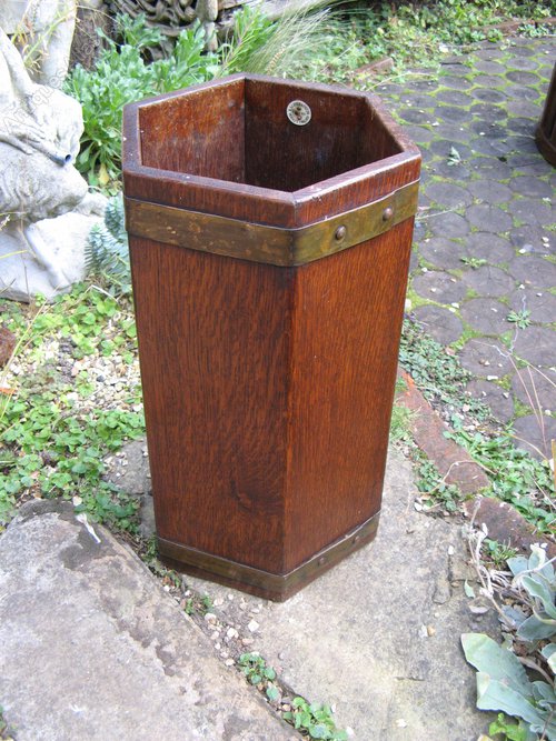 R A Lister Wood Craft of Dursley oak and brass banded waste paper bin or stick stand. 19.75 in high x 9.5 in wide