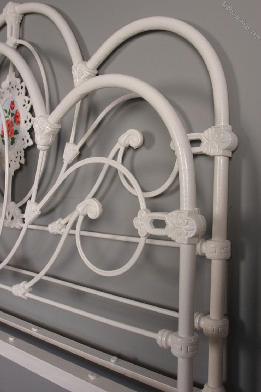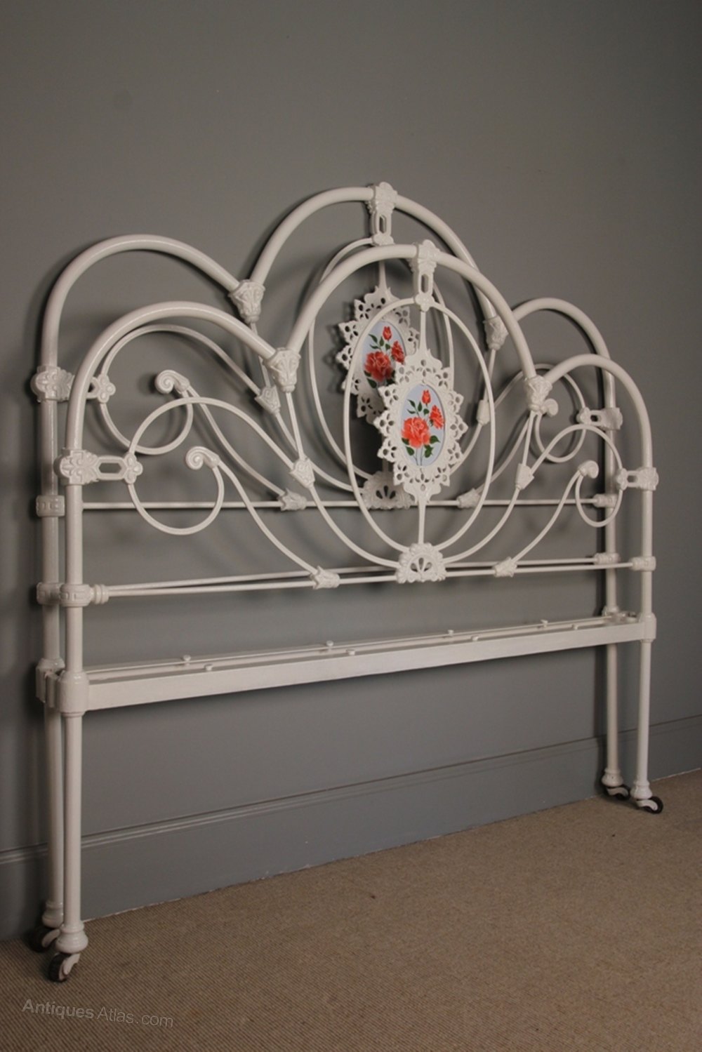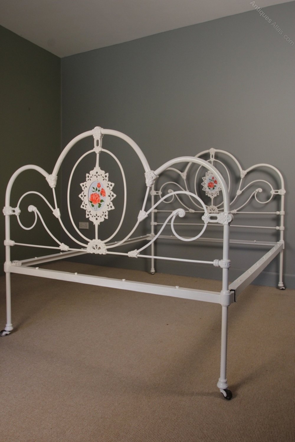 A beautiful rare 3 Hooper cast iron bed having scrolled decorative ends with a hand painted decorated panel to each end. Raised on the original porcelain castors. Superb condition throughout. This bed comes complete with a wooden slatted base and takes a standard Double (4ft 6") mattress.