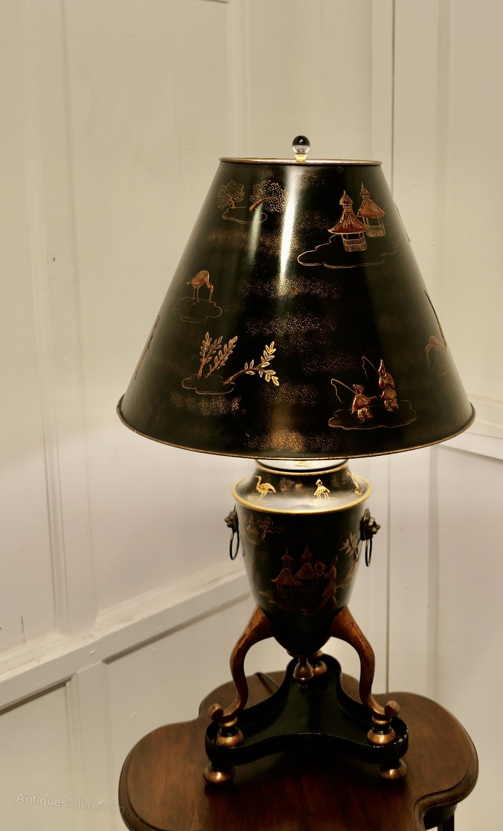 Both the lamp and the shade are made in Toll decorated in the Japanese Style with Pagodas, Palms and many characters