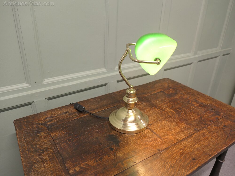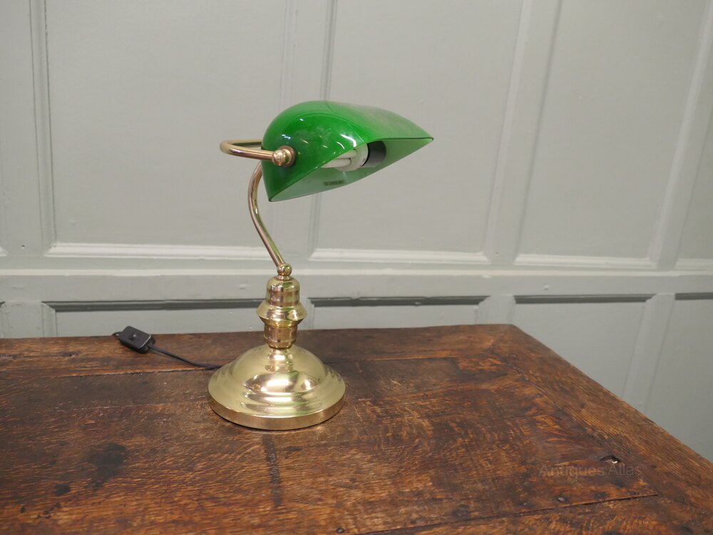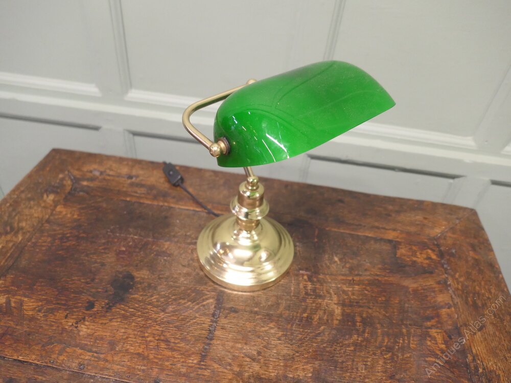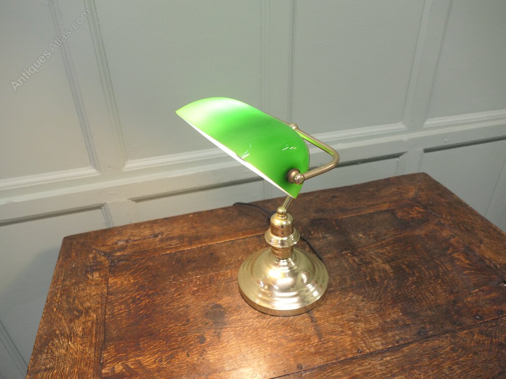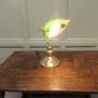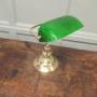 A beautiful vintage barrister’s brass desk lamp, with its original green glass lampshade which has a white reflective underside
