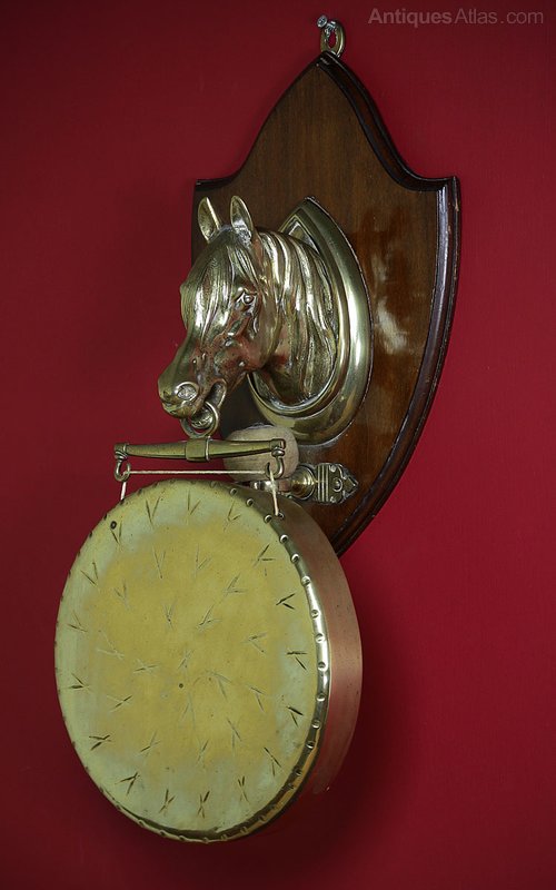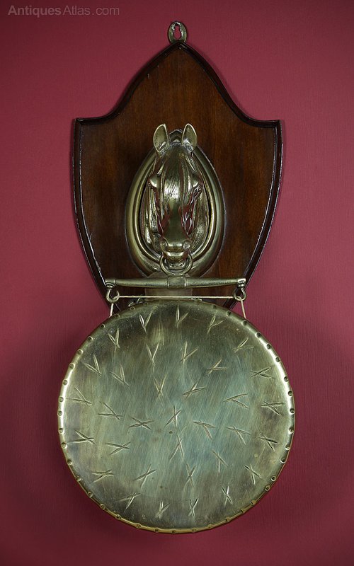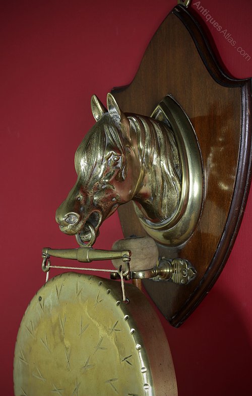 Good quality Edwardian era wall mounted dinner gong in the form of a horse’s head c.1910. 10″ diameter circular gong tone hung from a well modelled horse’s head, crisply cast in brass and mounted on the original mahogany shield. Together with a period clapper held behind the gong on its own original bracket. The edge of the gong is slightly mis-shapen at the top, however this doesn’t seem to have effected its tone which is very good. Otherwise excellent condition.