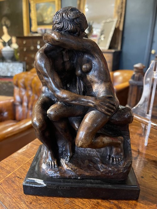 Solid Bronze of Rodin's 'The Kiss', depicting two lovers in embrace. Mounted on a black marble base and measuring approx 22 cms high. 1960s