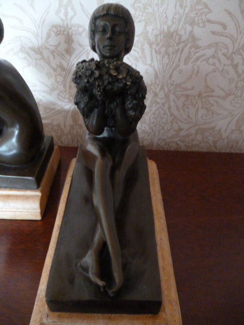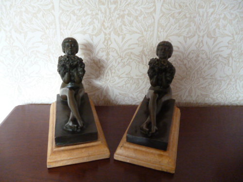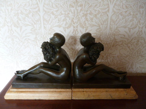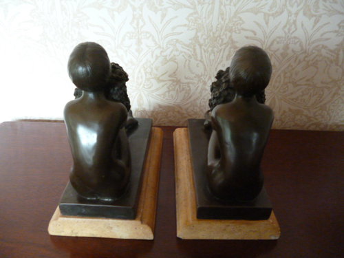 Elegant pair of bronze bookends of deco nude women holding bouquet of flowers, they sit on a marble base.