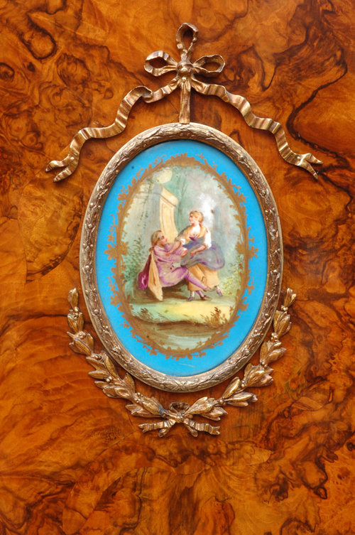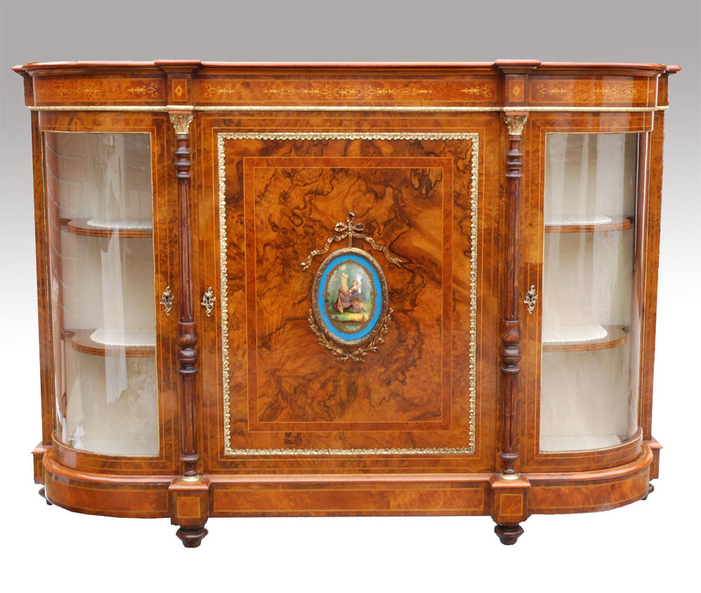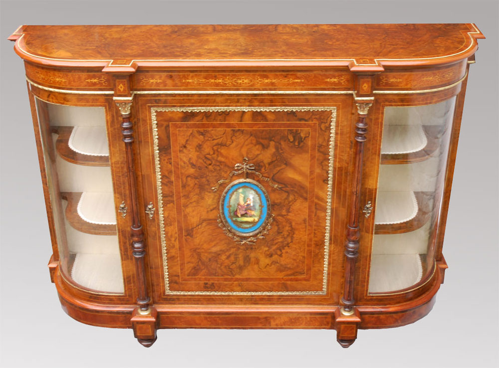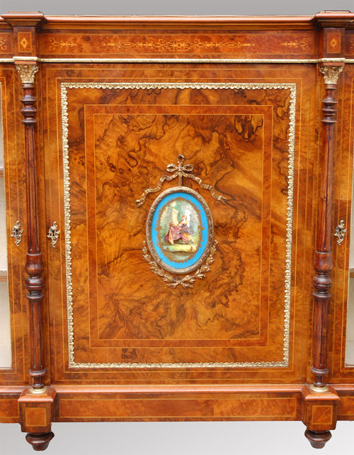 A Victorian ormolu mounted walnut credenza, the well figured top crossbanded in amboynas above a central door with Sevres porcelain panel in ormolu frame, flanked by fluted pilasters with Corinthian capitals and with bowed glazed door to either side enclosing velvet lined shelves, raised on short bun feet.