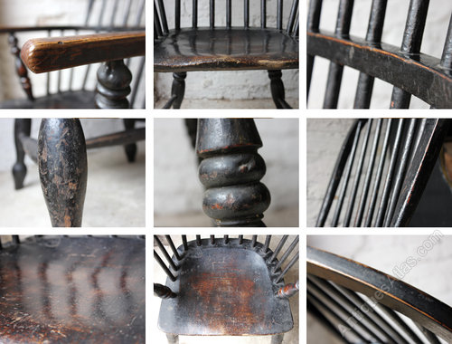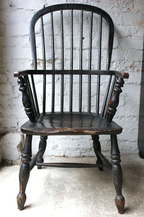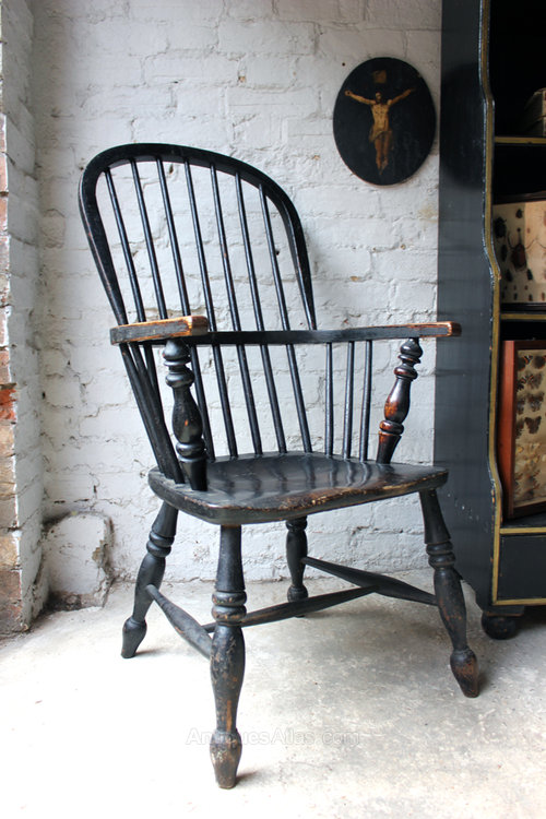 The Windsor chair is recognised as one of the classics of English country antique furniture While it is thought that the name of the English Windsor chair derives from its creation in the Windsor area, the High Wycombe area is well known as a key part of the country where these chairs were made. The most famous of them all is the armchair design. This has a single piece of wood curved round the chair to form the arms and the back. Windsor chairs were made in a wide range of styles and there are distinct regional variations from all over Britain and the USA where the form was equally popular. Period Windsor chairs, when they were new, were painted and they were frequently made from different types of wood and thus the paint tied the pieces together.